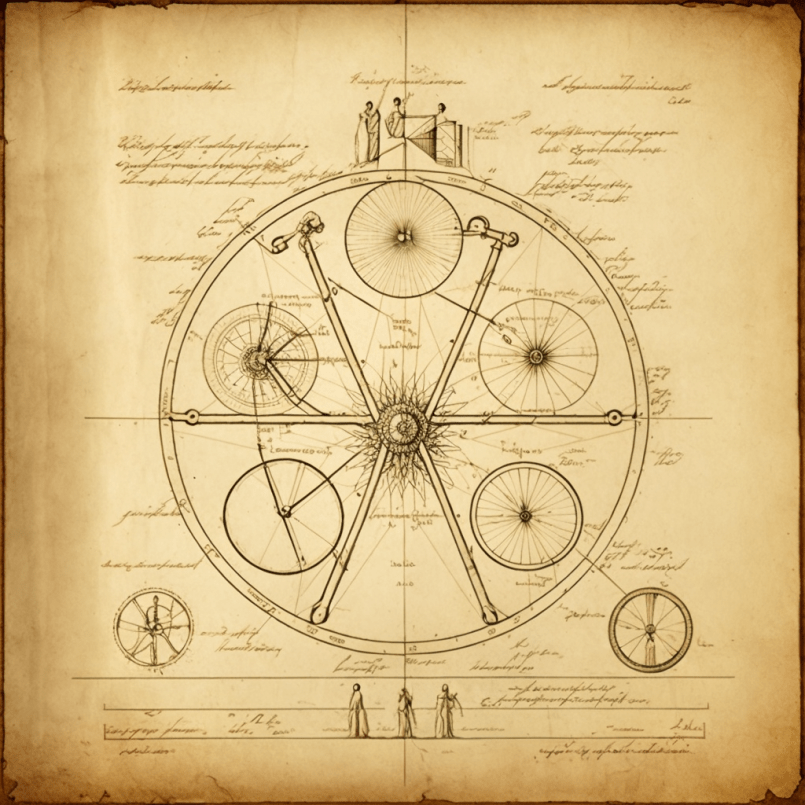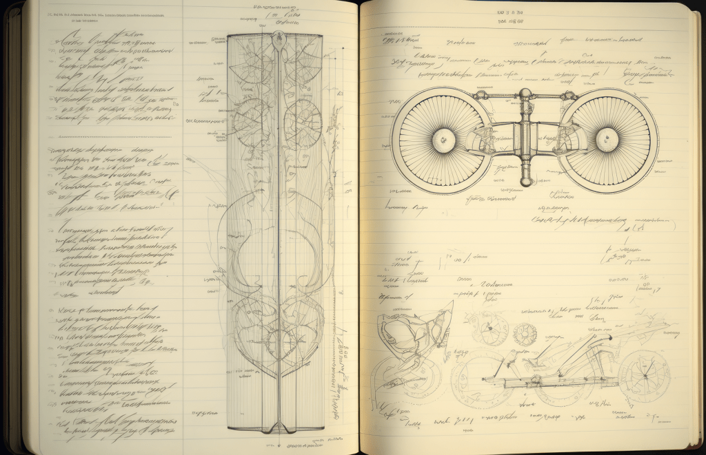 The design process in an engineering notebook for a bicycle built for two Vitruvian men. Include mechanical diagrams of intricate and precise detail, CAD, ink and pencil, based on the laws of physics and latest scientific data, comprehensive notes and references. Design by Karl von Drais, Mannheim, Germany. Built in a Tesla factory, California, USA.
