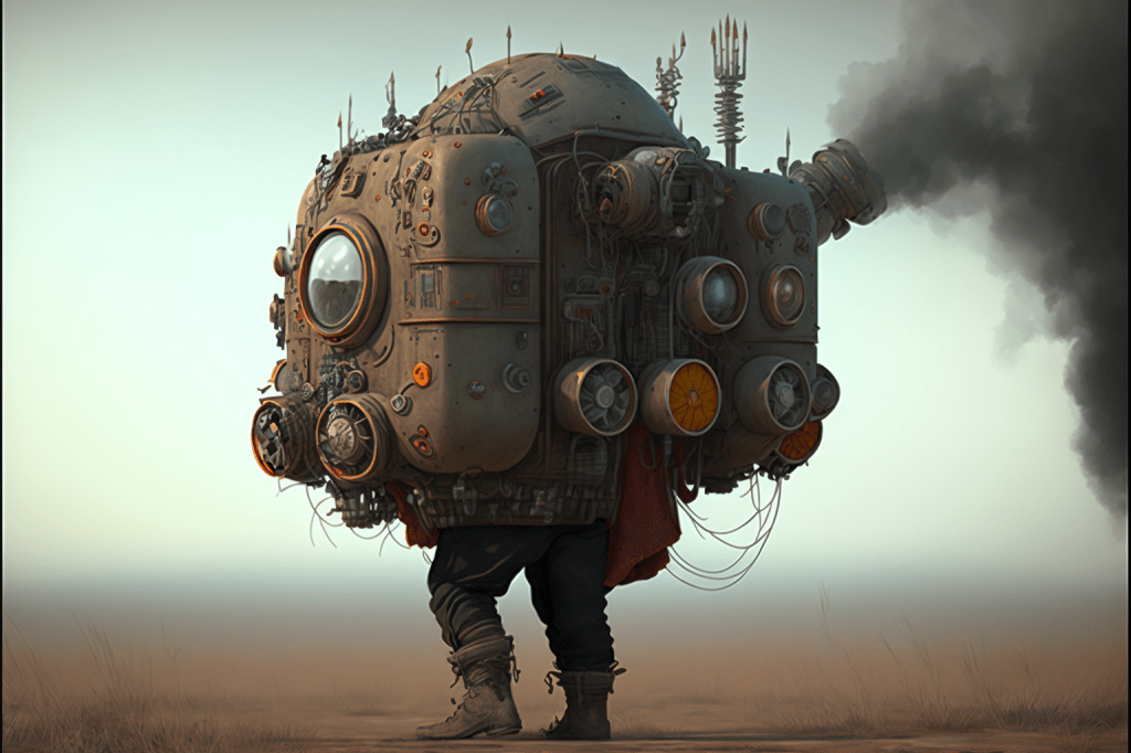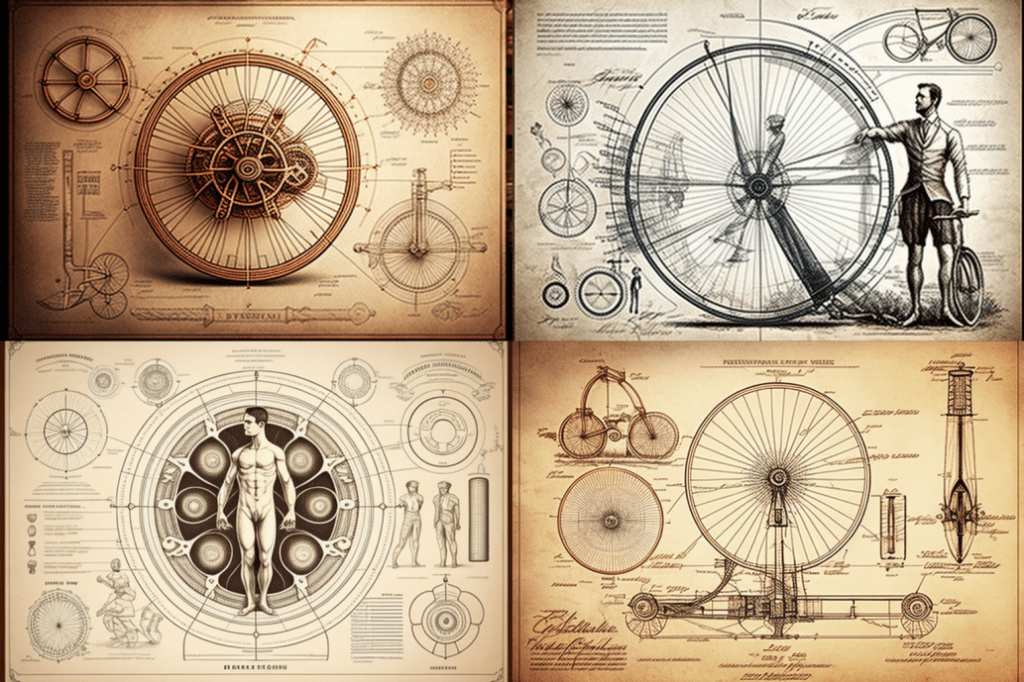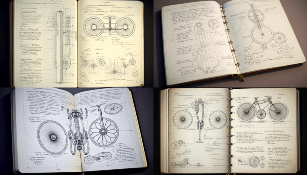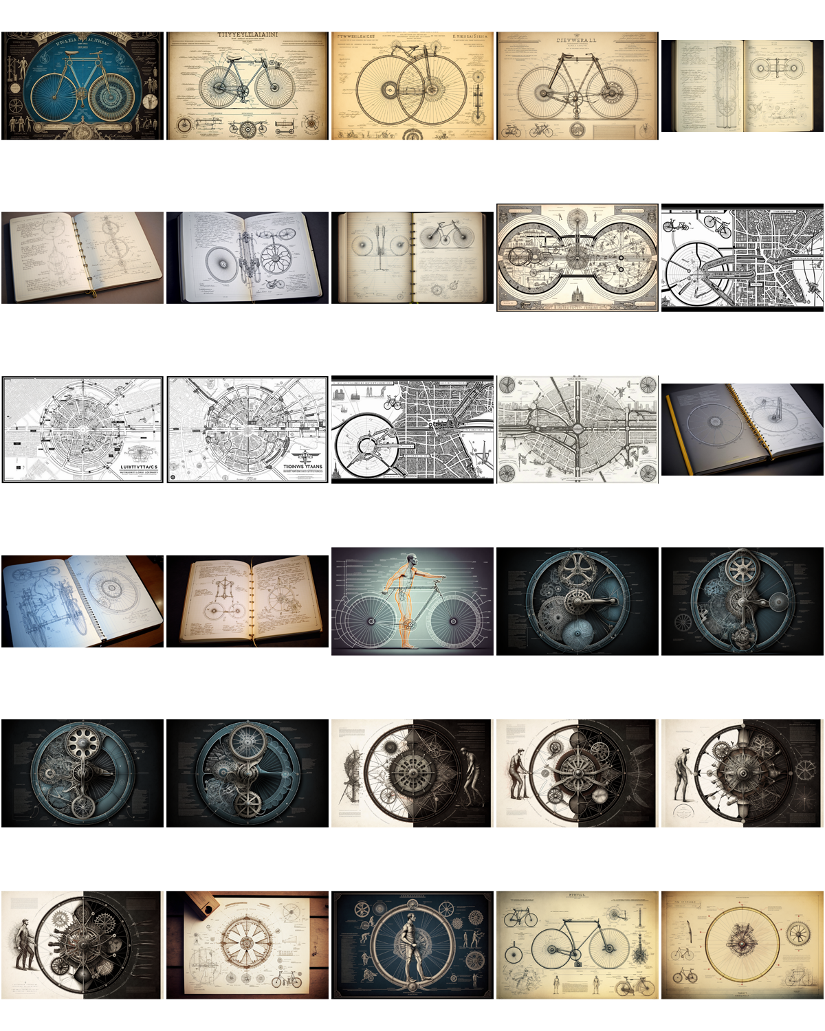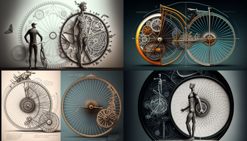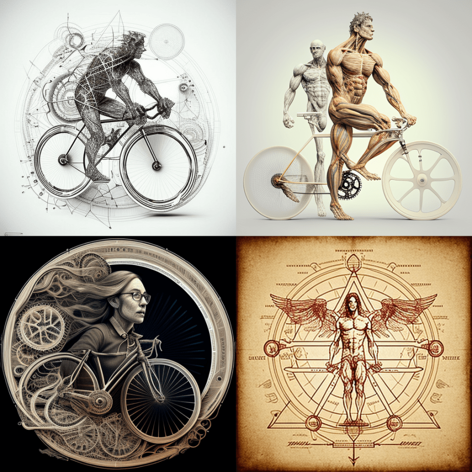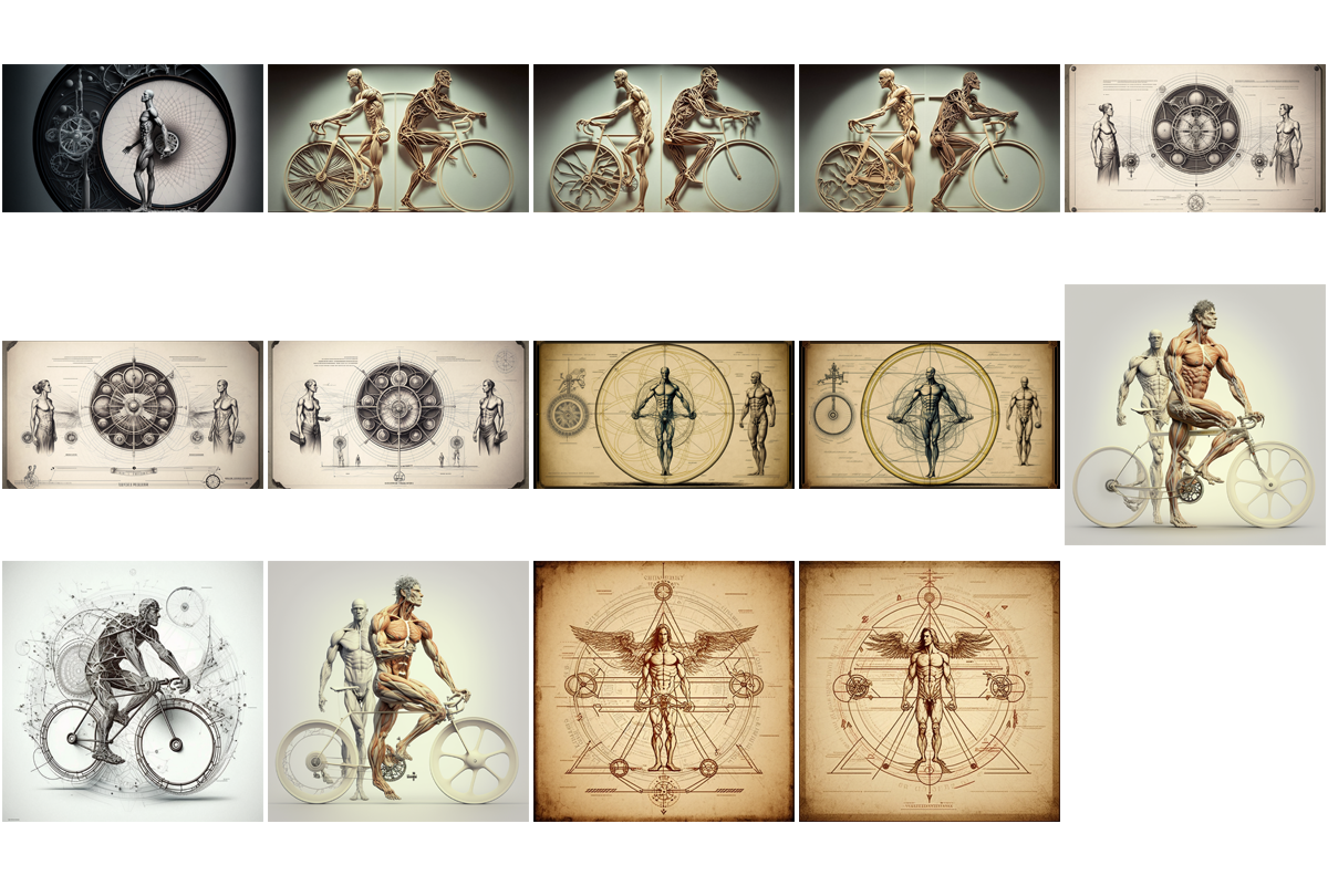 Ah, a symphony of images to decry those who would say that AI is incapable of ‘drawing’ bicycles (myself the one who tried to trick it so)! Constructions of flesh and machinery abound here – castrated but not prostrated, they stand tall but often withered. Attempts at human writing have been made, the forms familiar but mysterious.