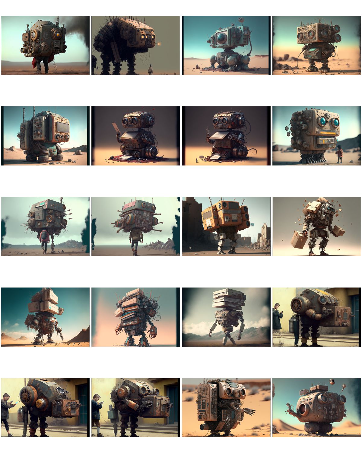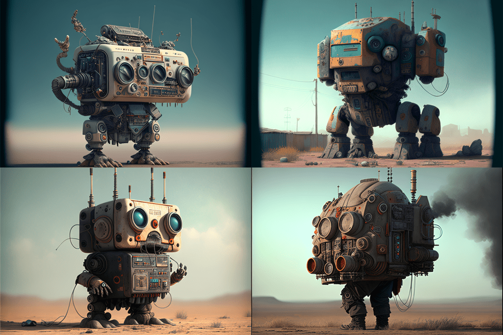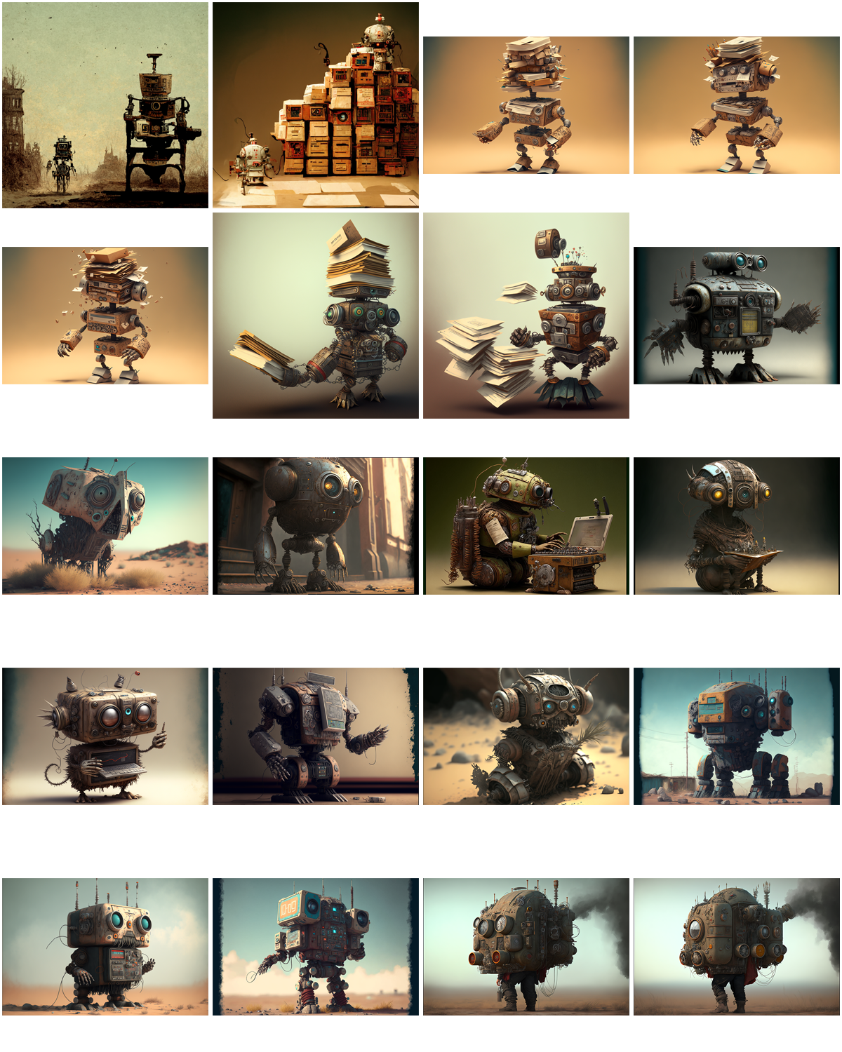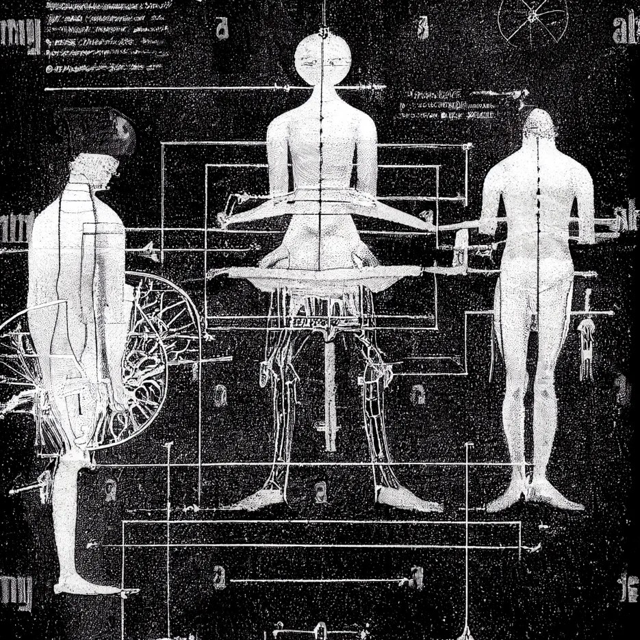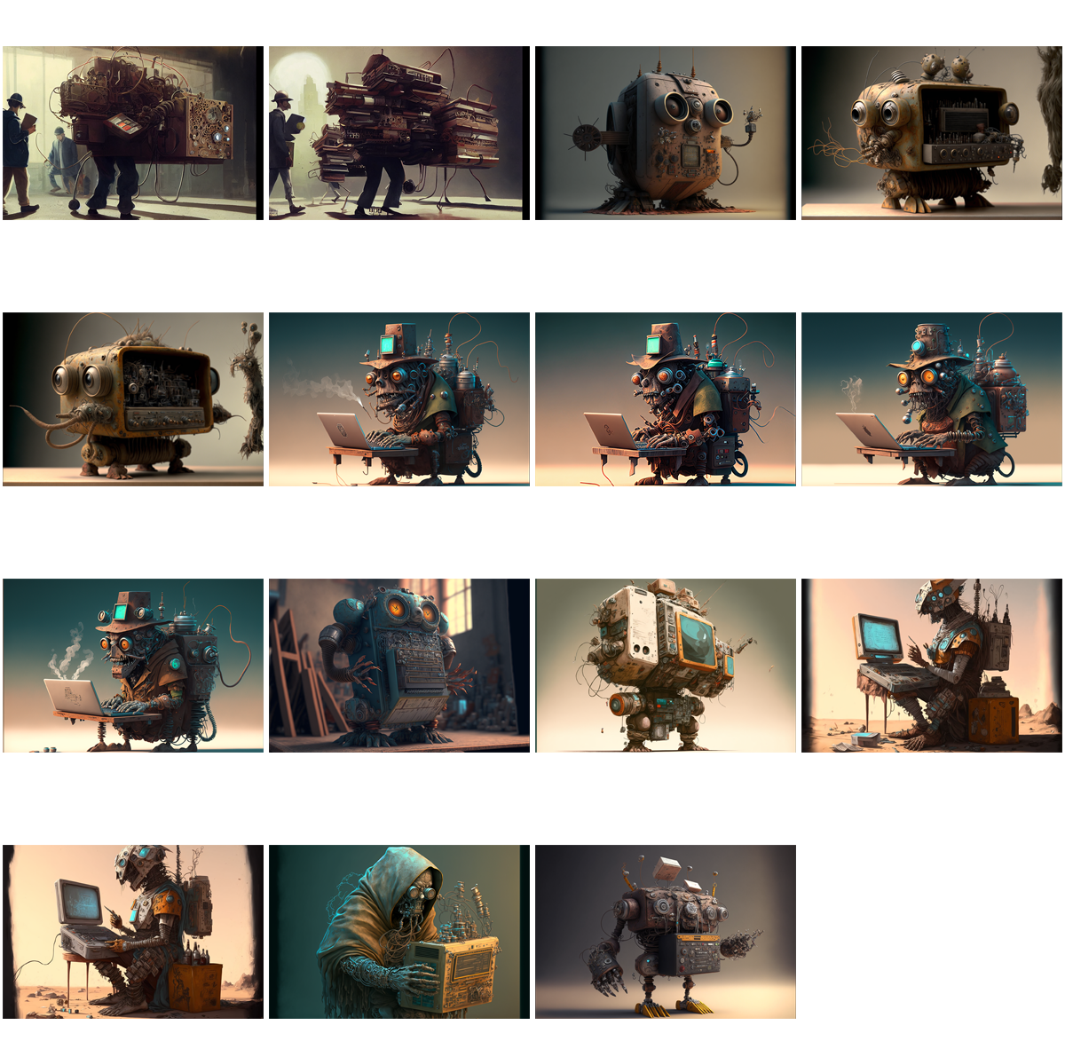 Ah, a symphony of images to decry those who would say that AI is incapable of ‘drawing’ bicycles (myself the one who tried to trick it so)! Constructions of flesh and machinery abound here – castrated but not prostrated, they stand tall but often withered. Attempts at human writing have been made, the forms familiar but mysterious.