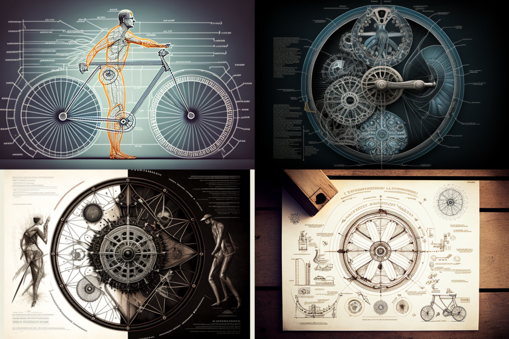 Ah, a symphony of images to decry those who would say that AI is incapable of ‘drawing’ bicycles (myself the one who tried to trick it so)! Constructions of flesh and machinery abound here – castrated but not prostrated, they stand tall but often withered. Attempts at human writing have been made, the forms familiar but mysterious.
