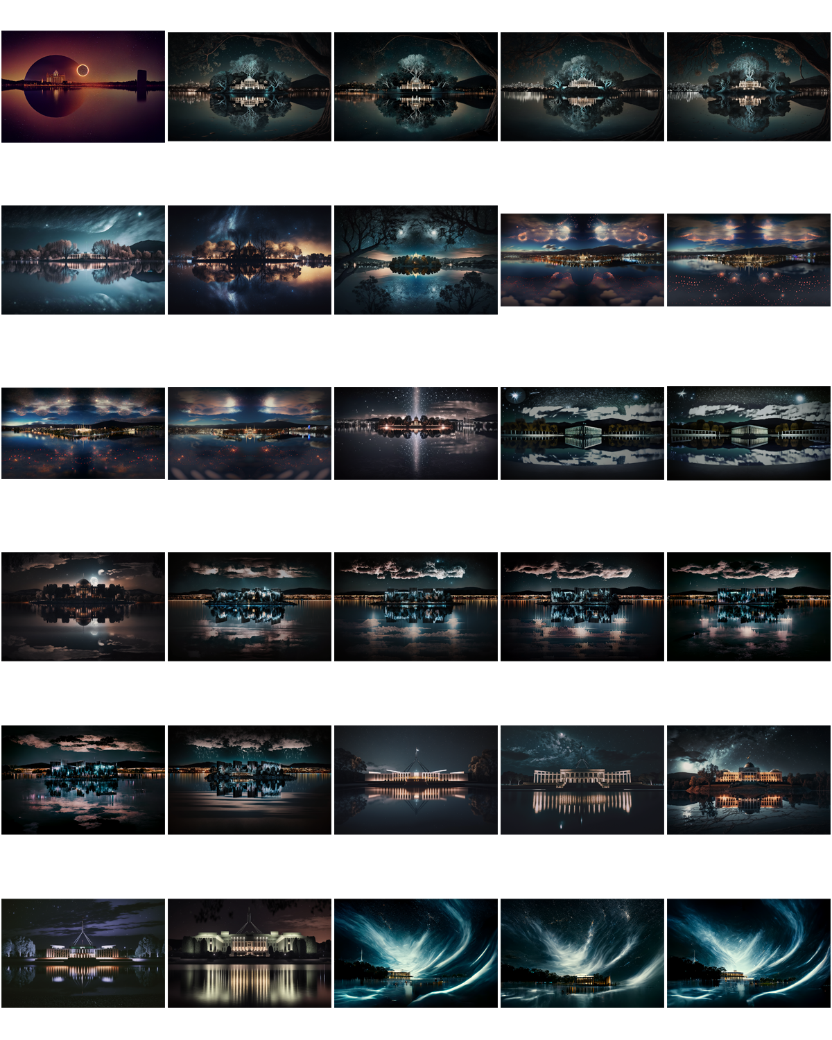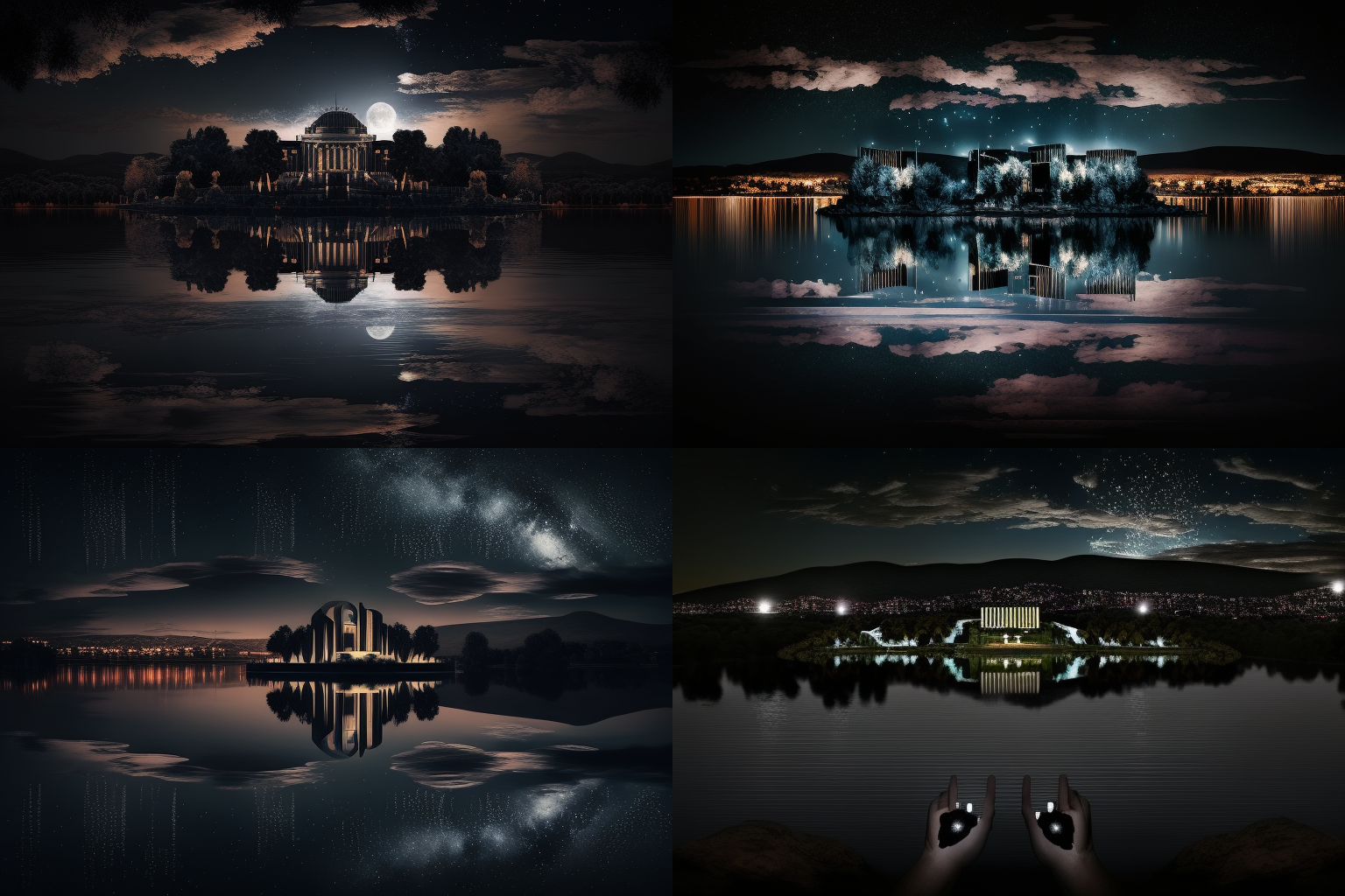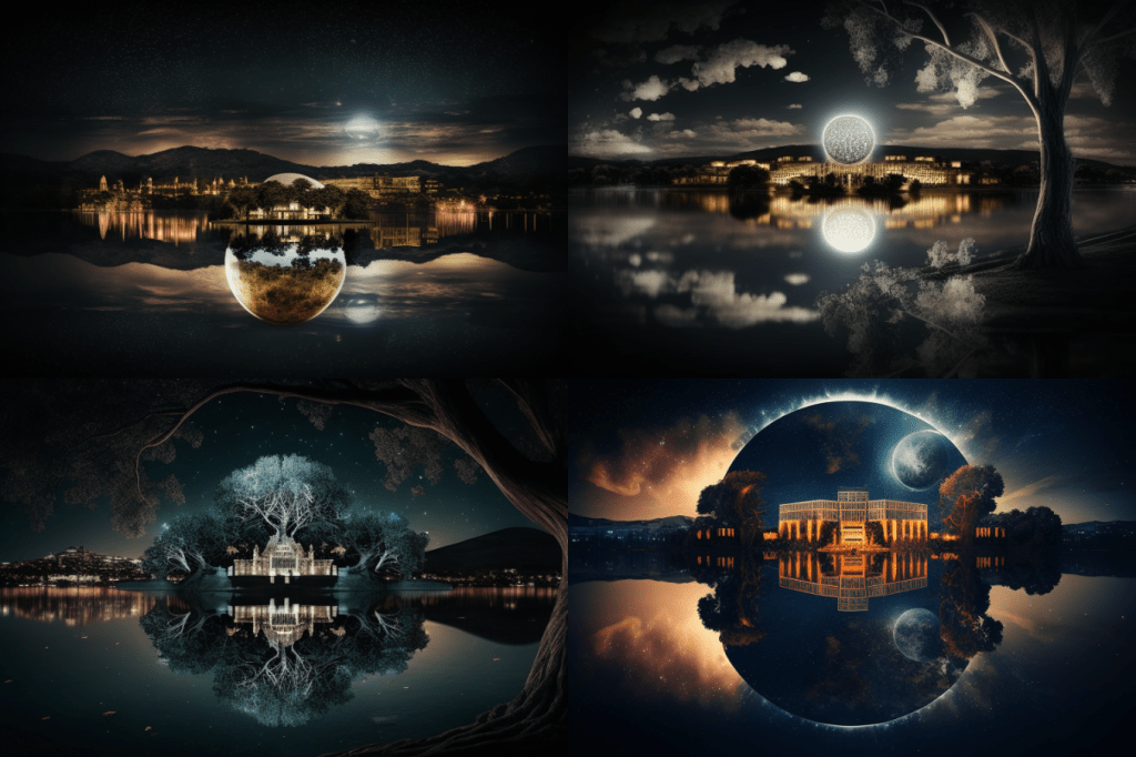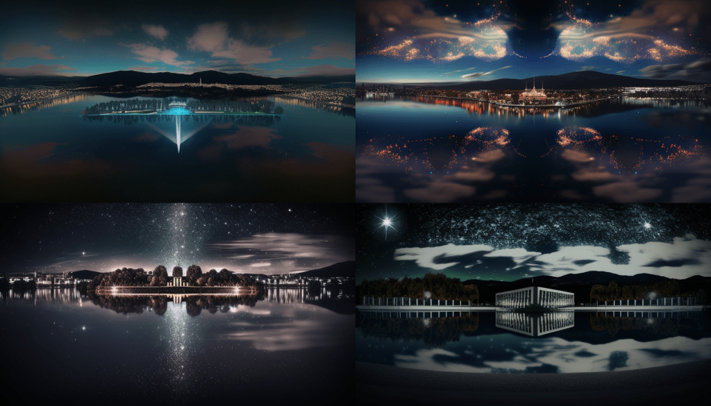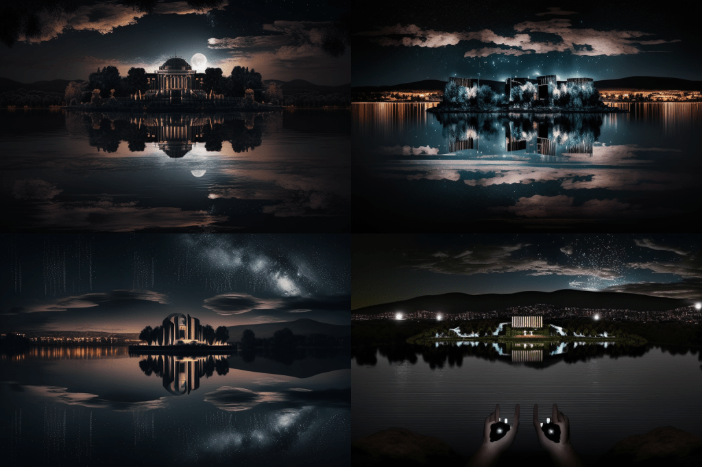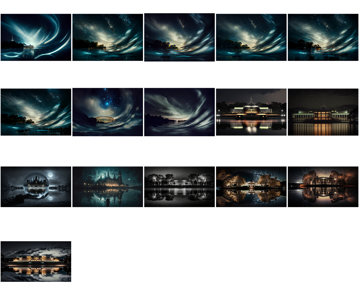 And following that, my next thoughts were that these look like a generic set of images for a speculative fiction novel (especially a graphic novel) or a TV show. There is a looming quality about most of them, a hint of menace in the swirl of light and movement, a bit of a gothic element to the buildings in several of them (those that didn’t replicate Parliament House); or those with moons and sparkly stars / lights that to me seem to infuse a sort of old-fashioned romanticism.
