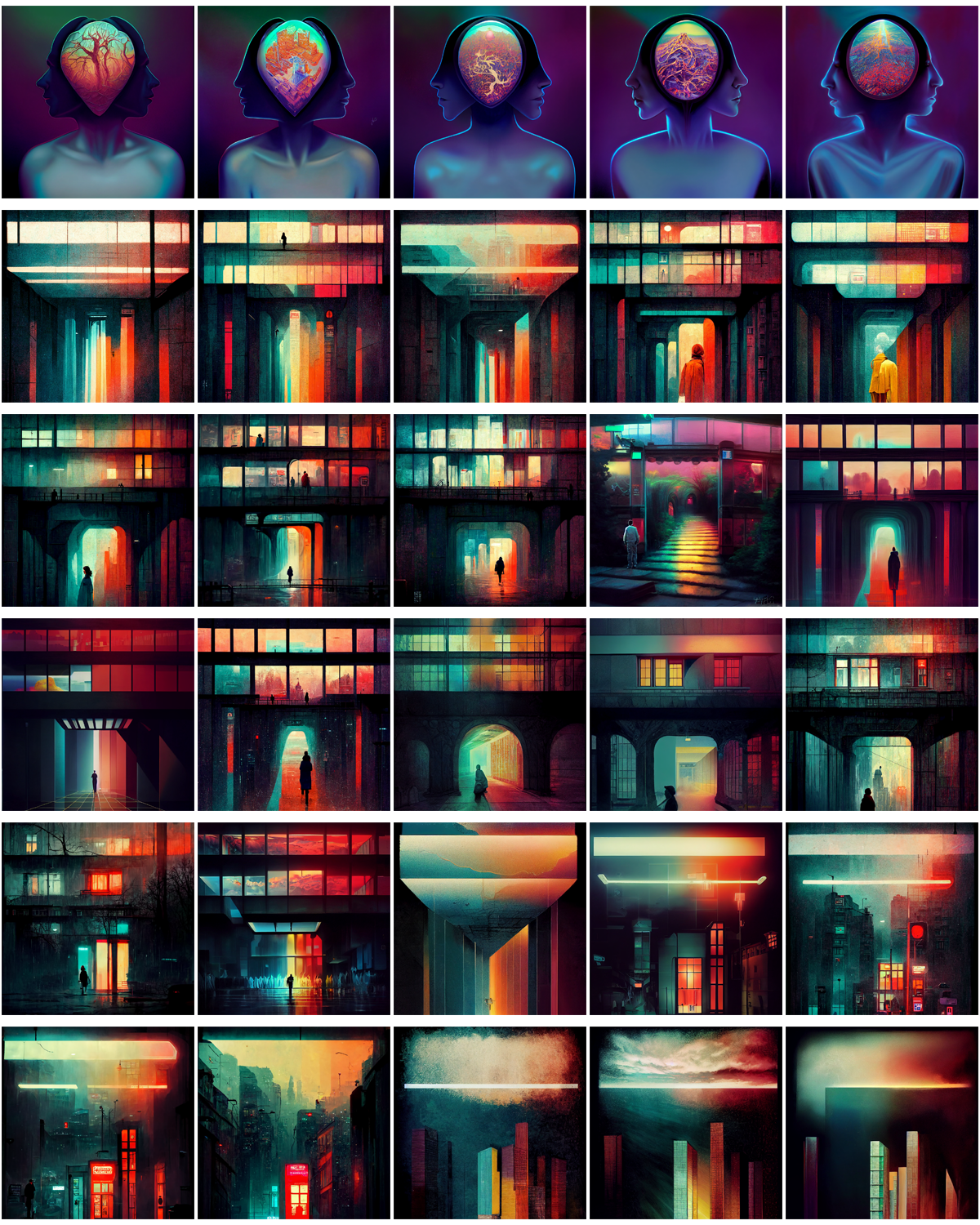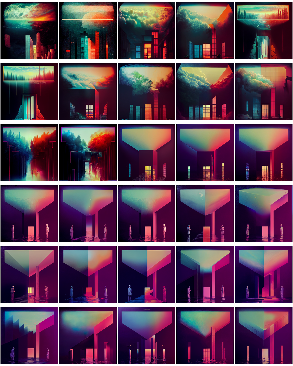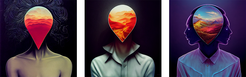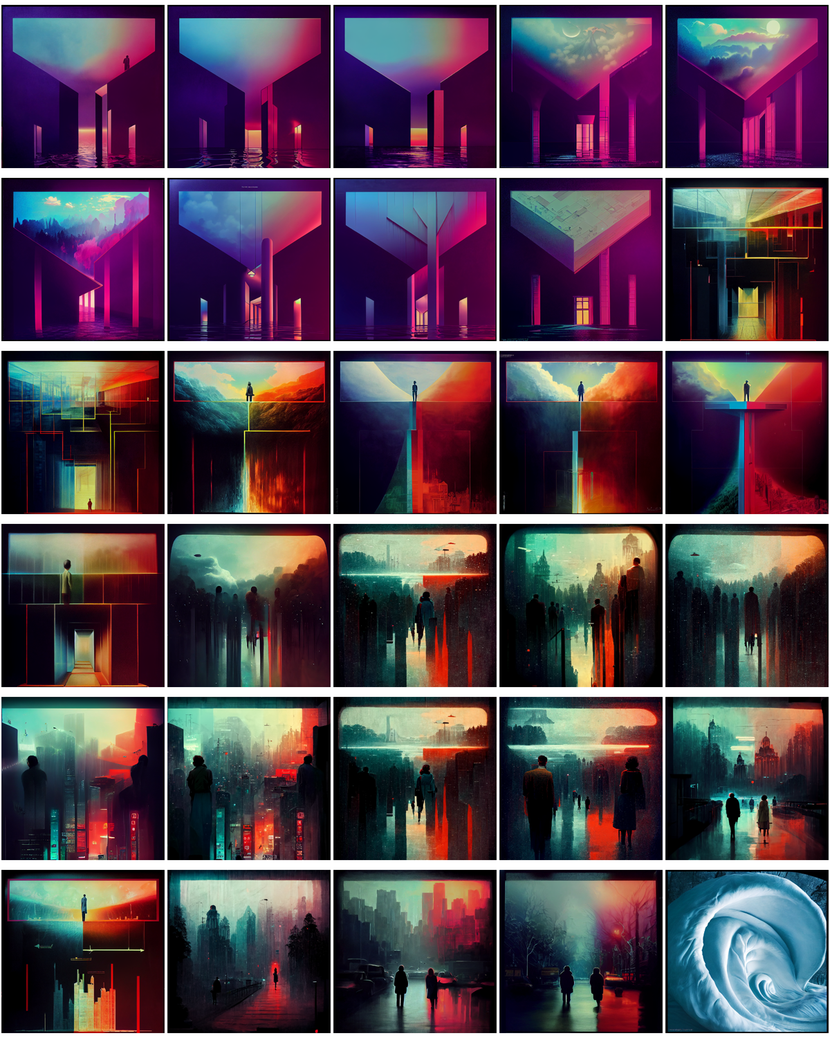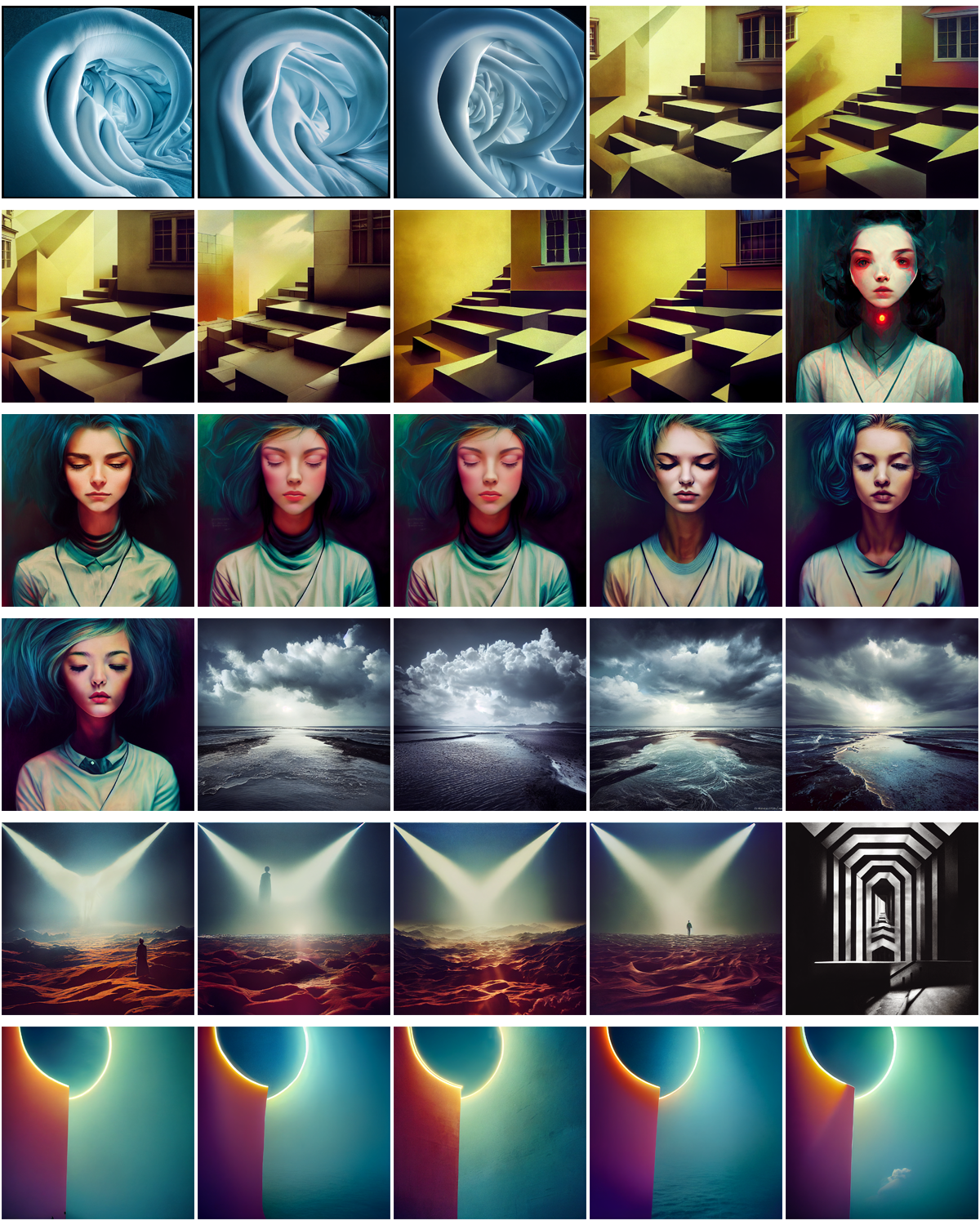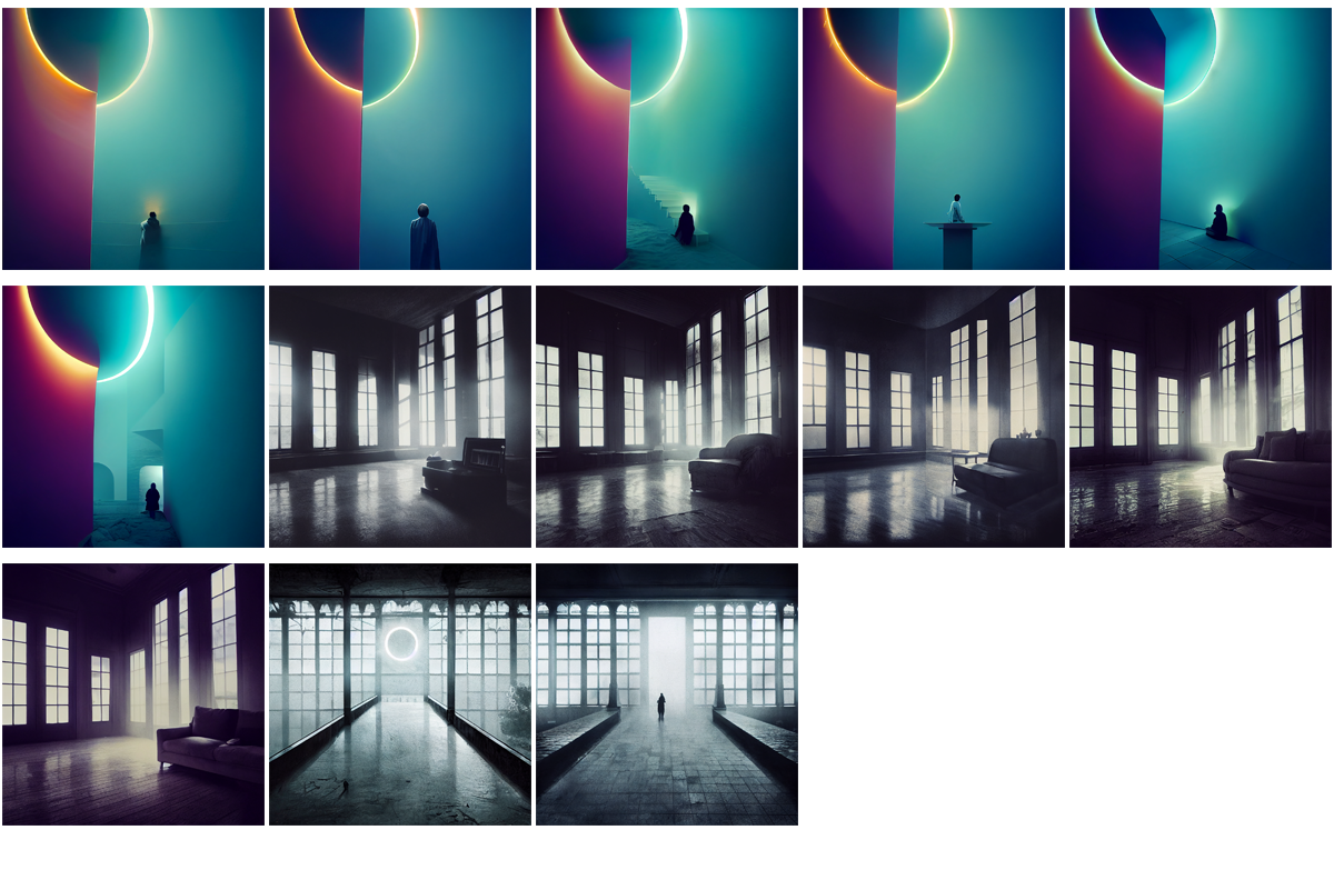 Aesthetically to me the last four images are a touch sci-fi or even pseudo new-age, especially the latter images with their slightly peculiar white outfits. They remind me of retro-futurism, almost what I would expect from AI in a way.
