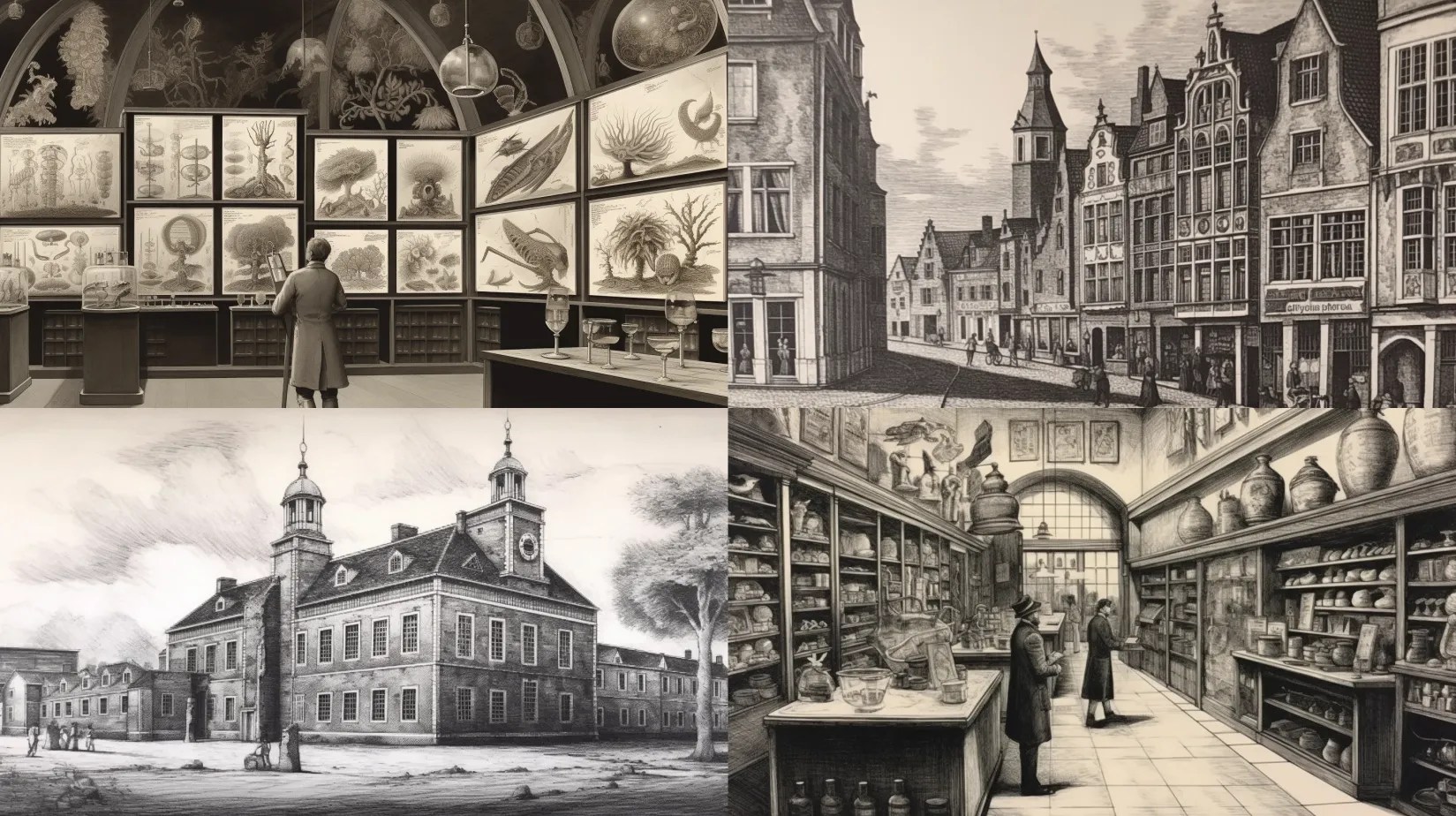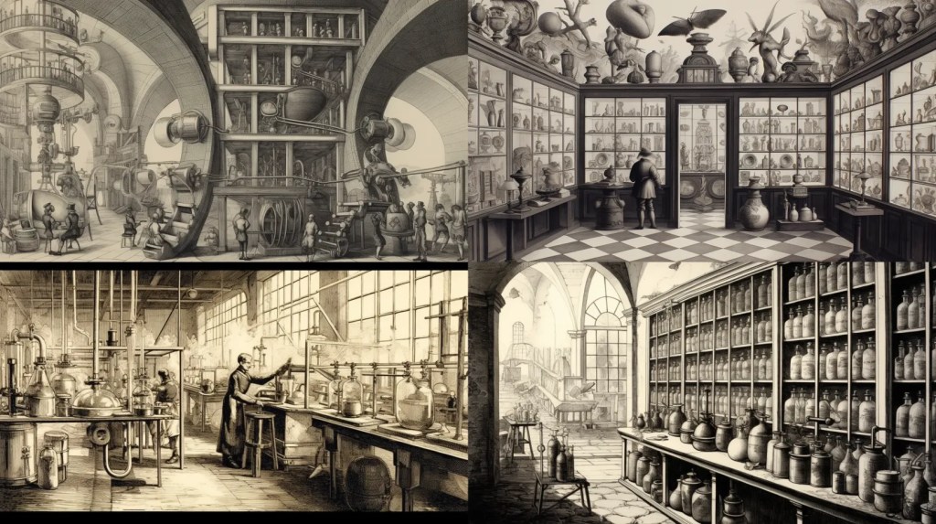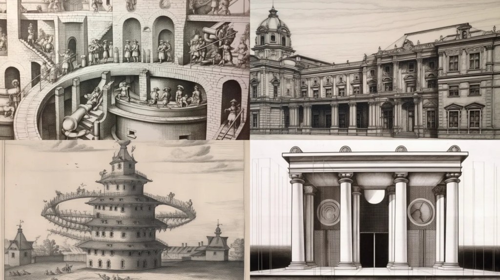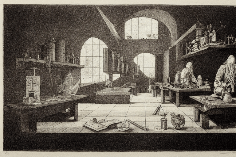 17th century etching in the style of Breugel of a Georgian vision of a 1970s modern research institute.