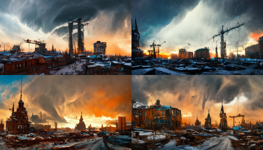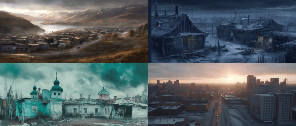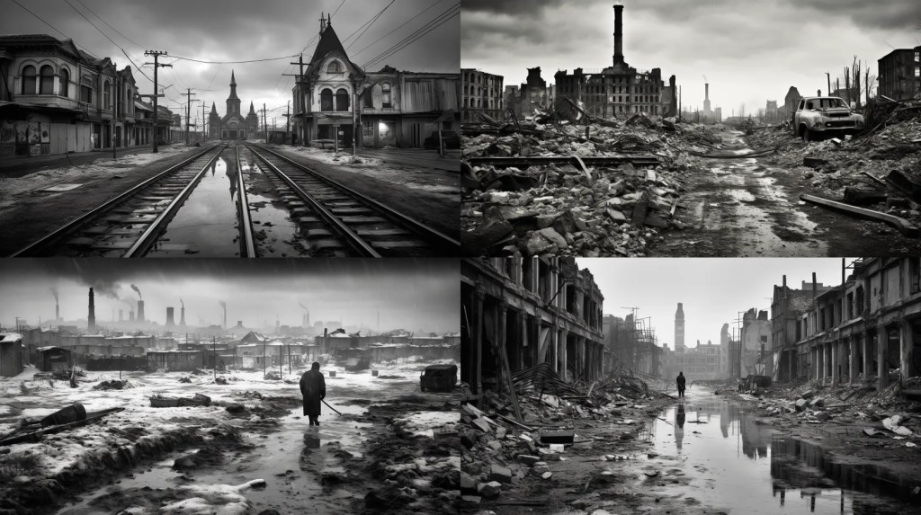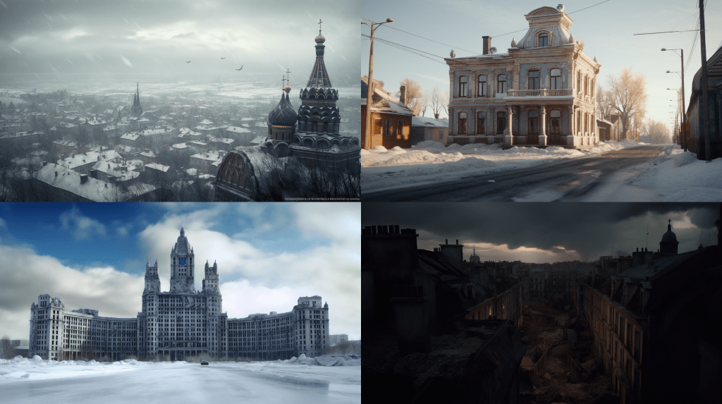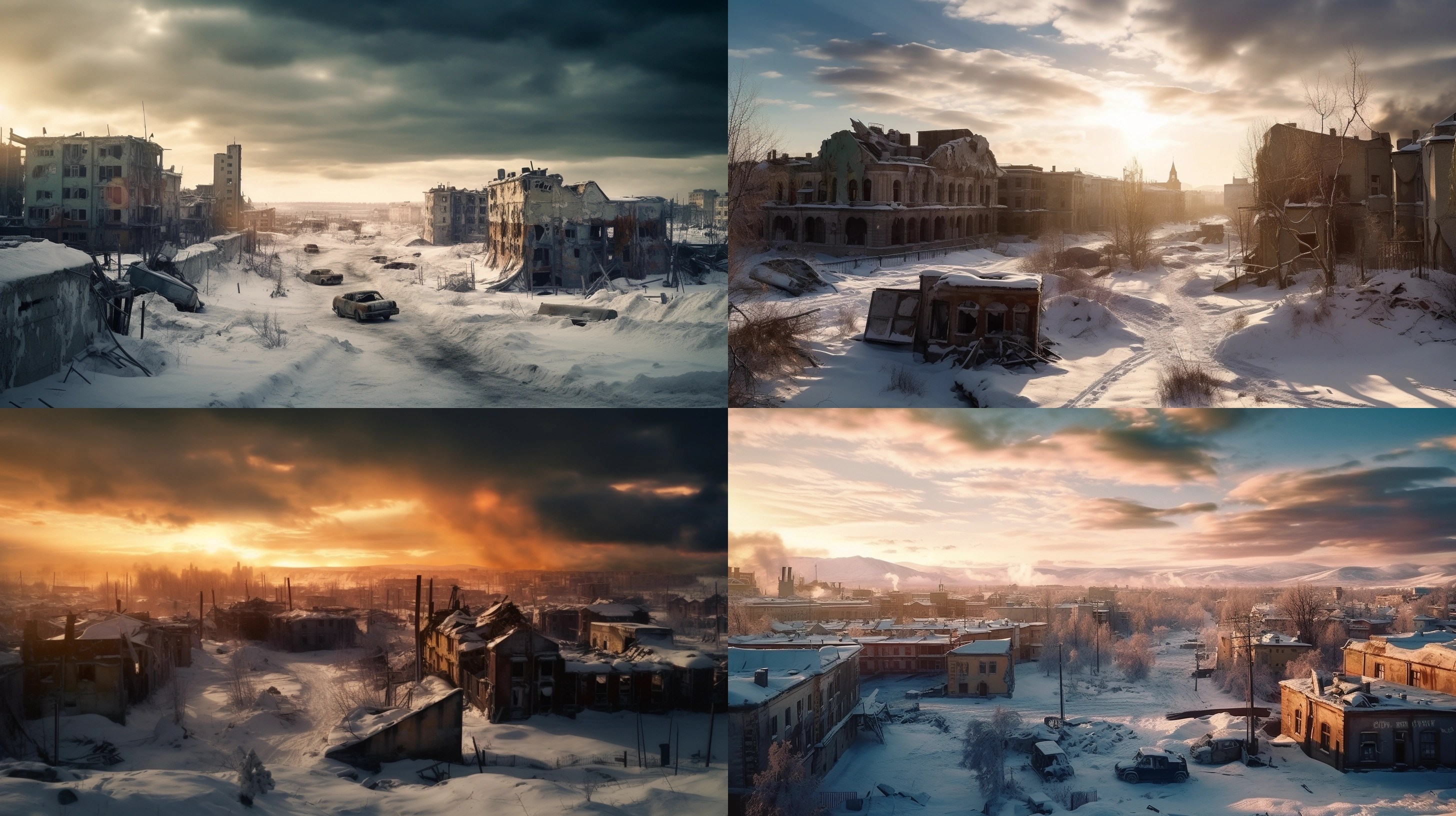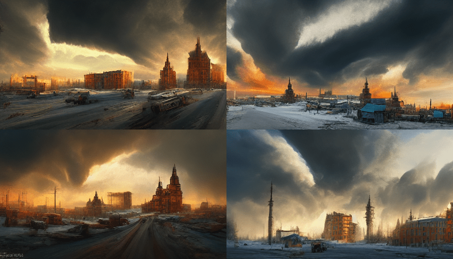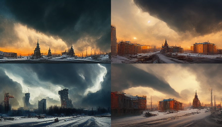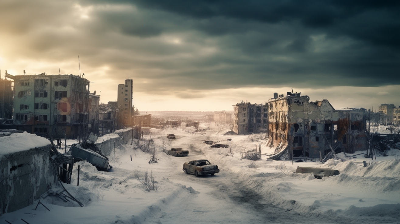 A decaying Siberian city in 2032 after a 10 year long war damaged the country, winter 10am light, dramatic sky.