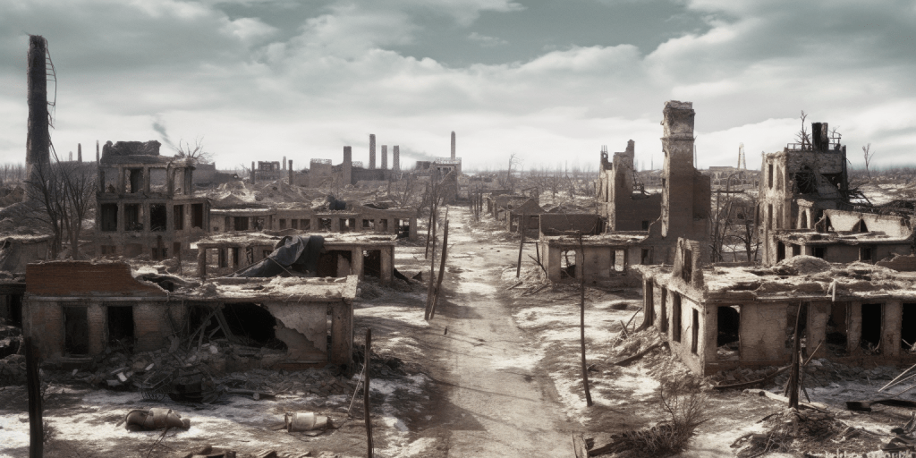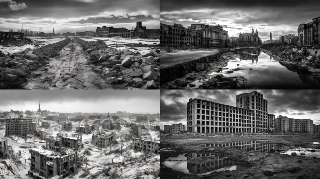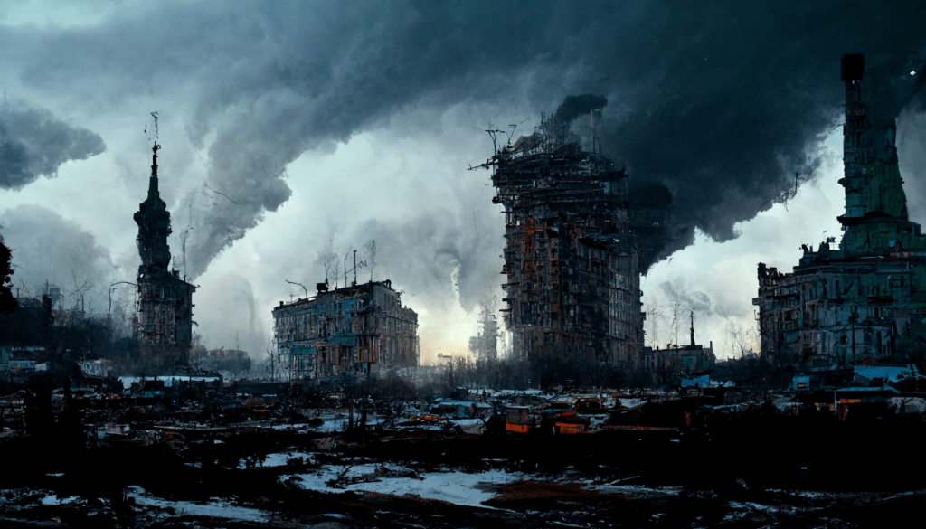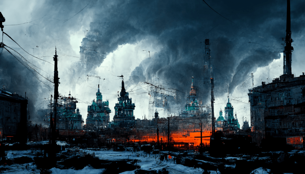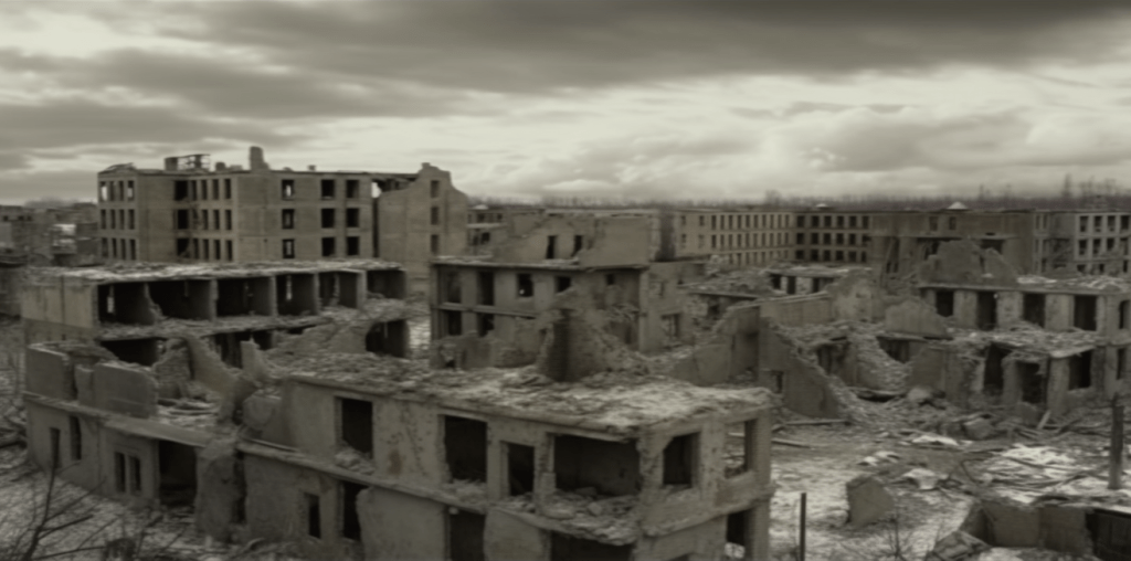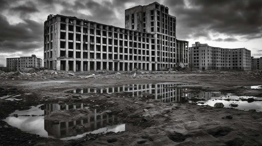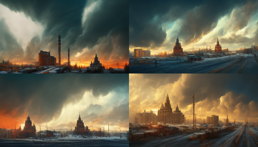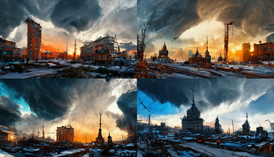 A decaying Siberian city in 2032 after a 10 year long war damaged the country, winter 10am light, dramatic sky.