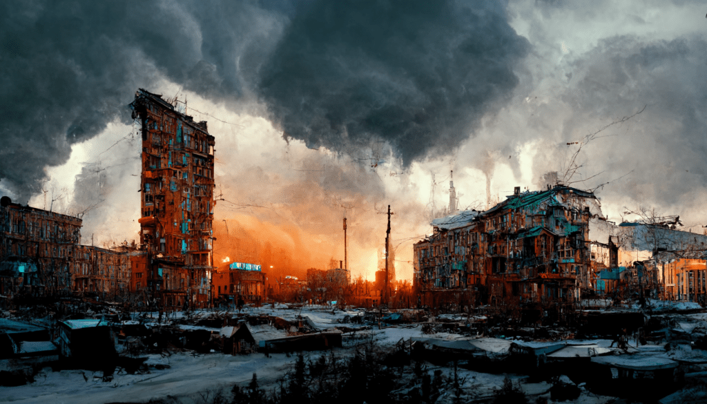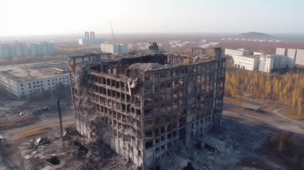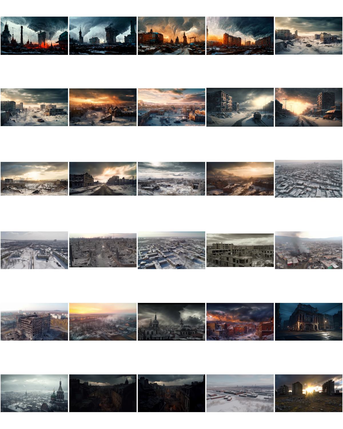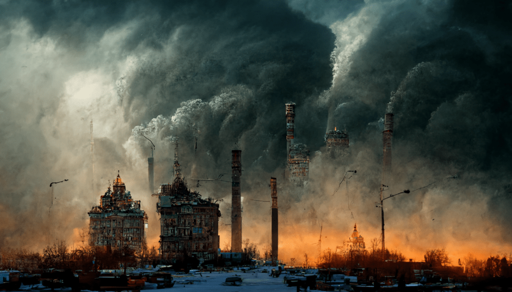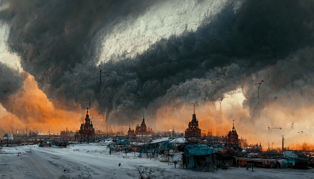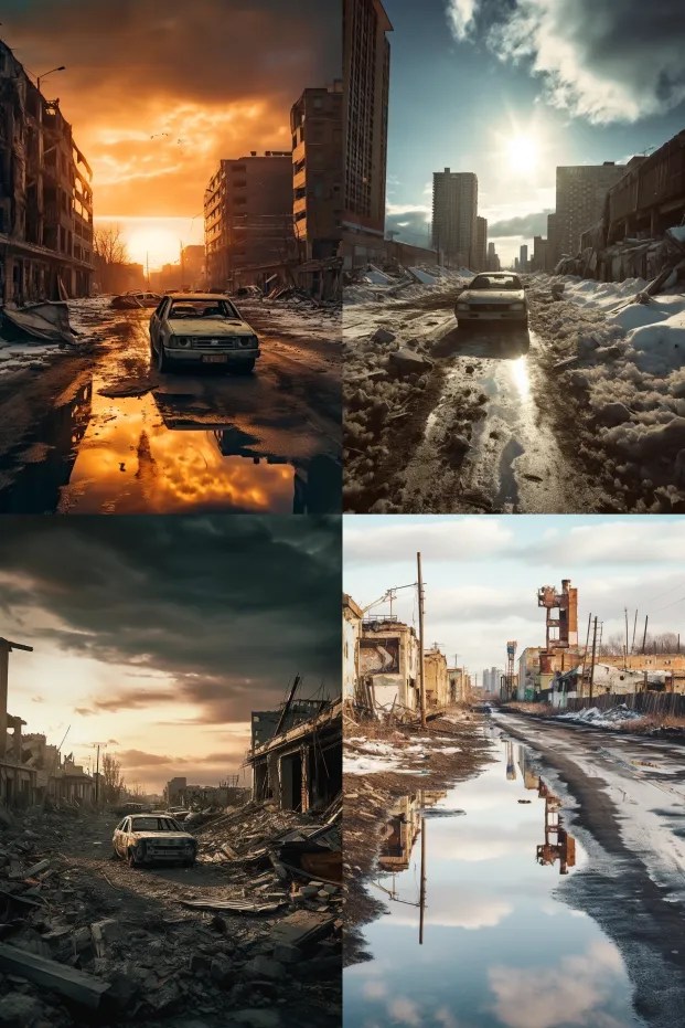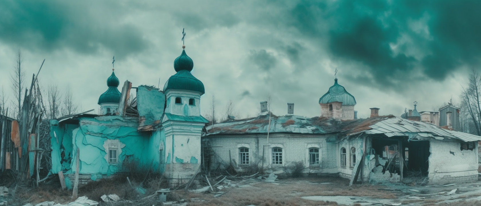 A decaying Siberian city in 2032 after a 10 year long war damaged the country, winter 10am light, dramatic sky.
