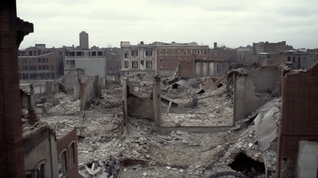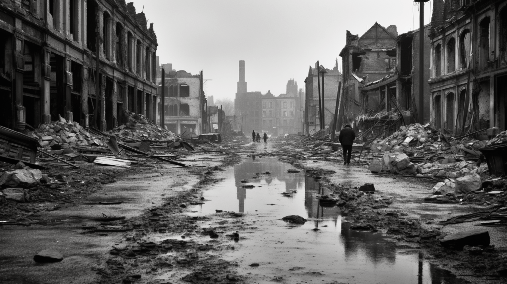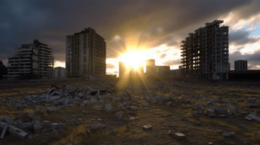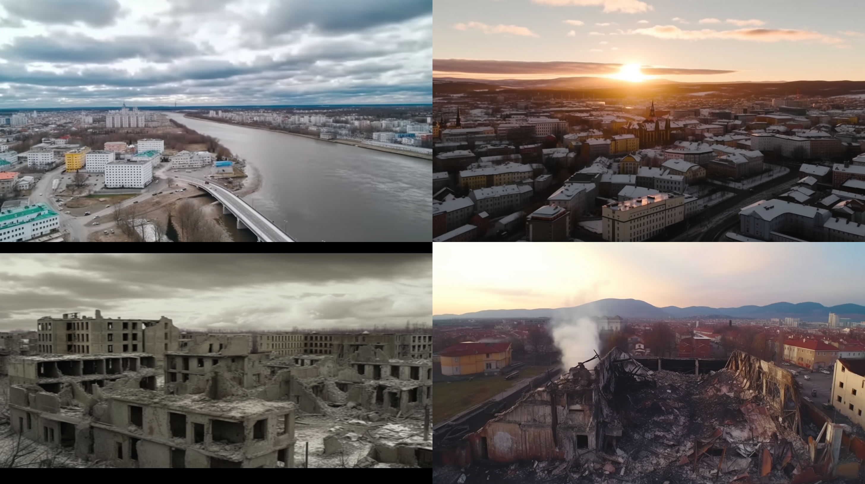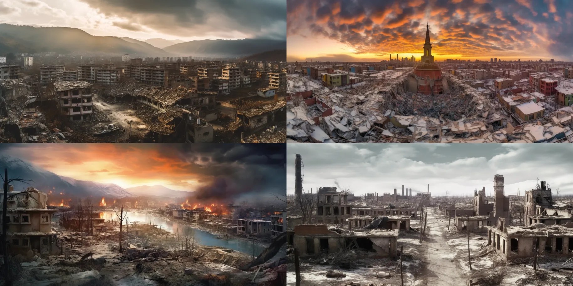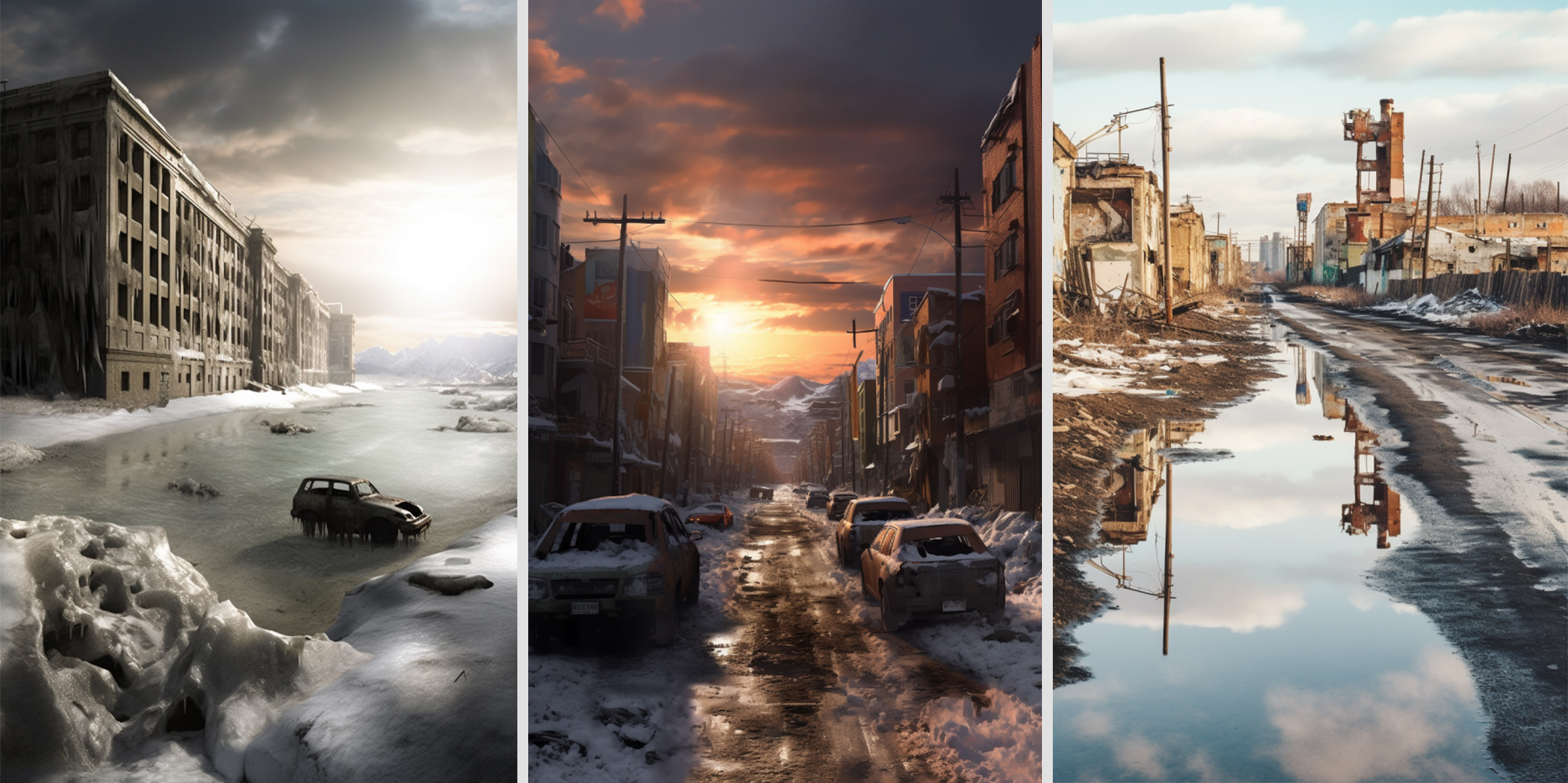 A decaying Siberian city in 2032 after a 10 year long war damaged the country, winter 10am light, dramatic sky.