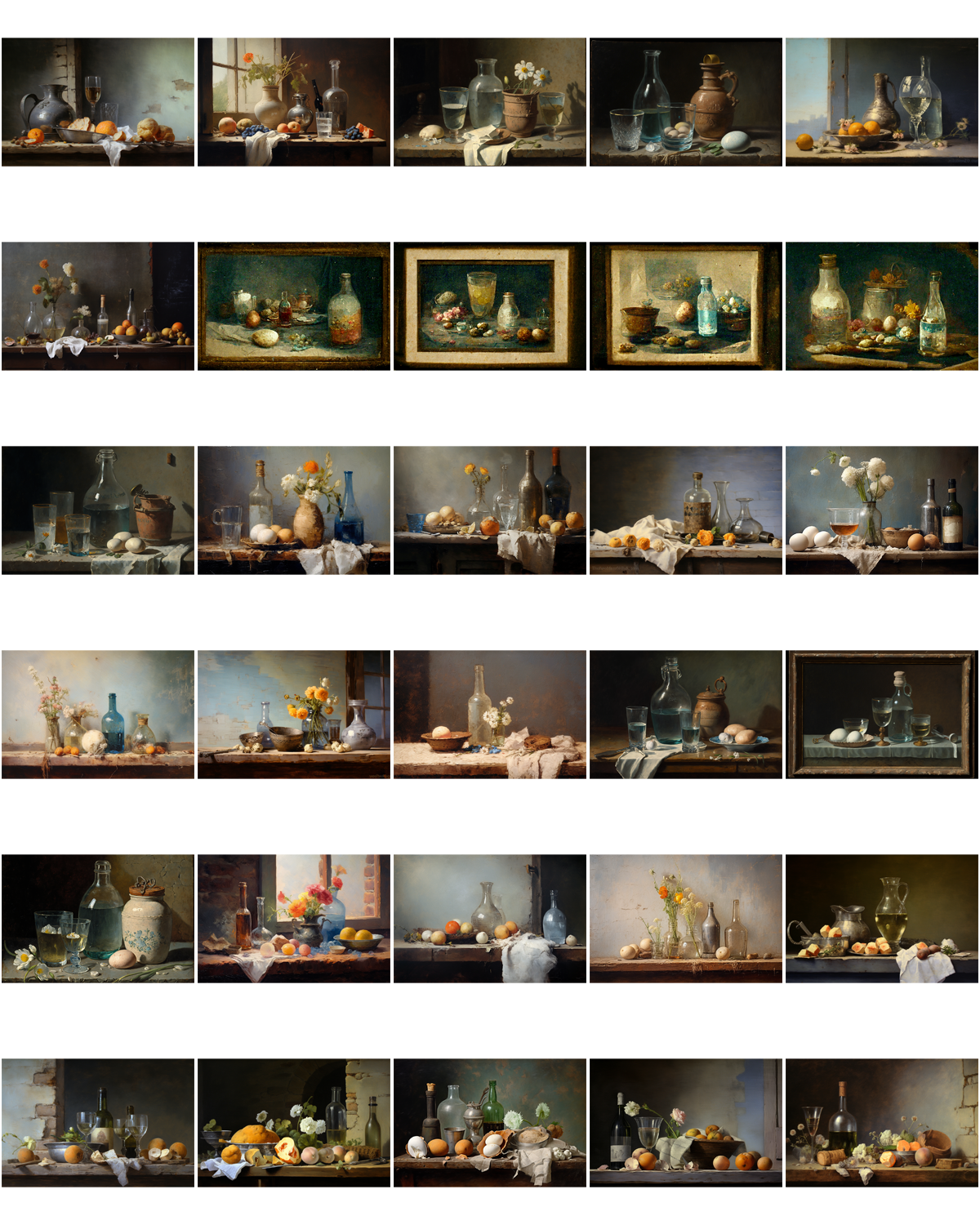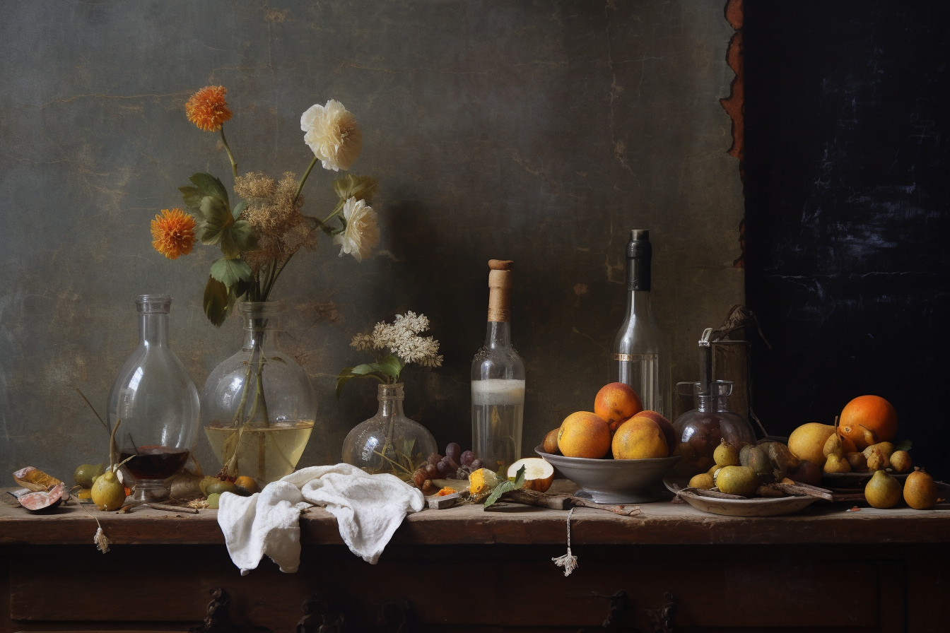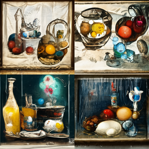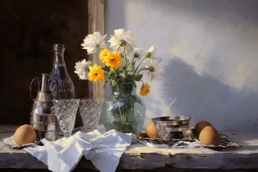 Still-life painting by Jean-Baptiste-Simeon Chardin, water glasses, water bottles, dry flowers, eggs, cloth, light from open window on the left, reflections on the wet wall, rainbow, mist, very detailed