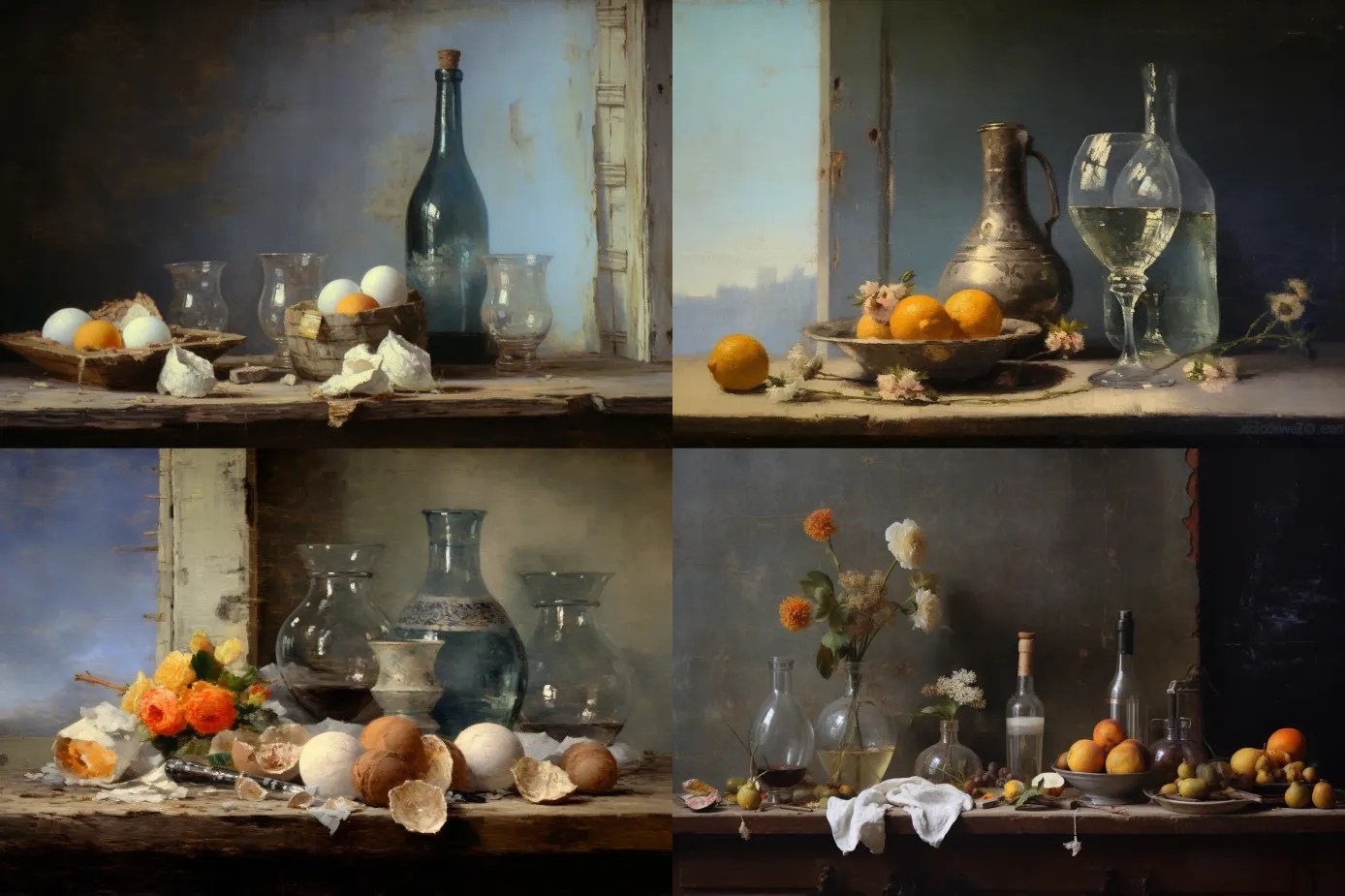 A recently discovered 18th century still-life oil painting in the granular impasto style of Jean-Baptiste-Simeon Chardin. Water glasses, water bottles, dry flowers, eggs, cloth, light from open window on the left, reflections on the wet wall.