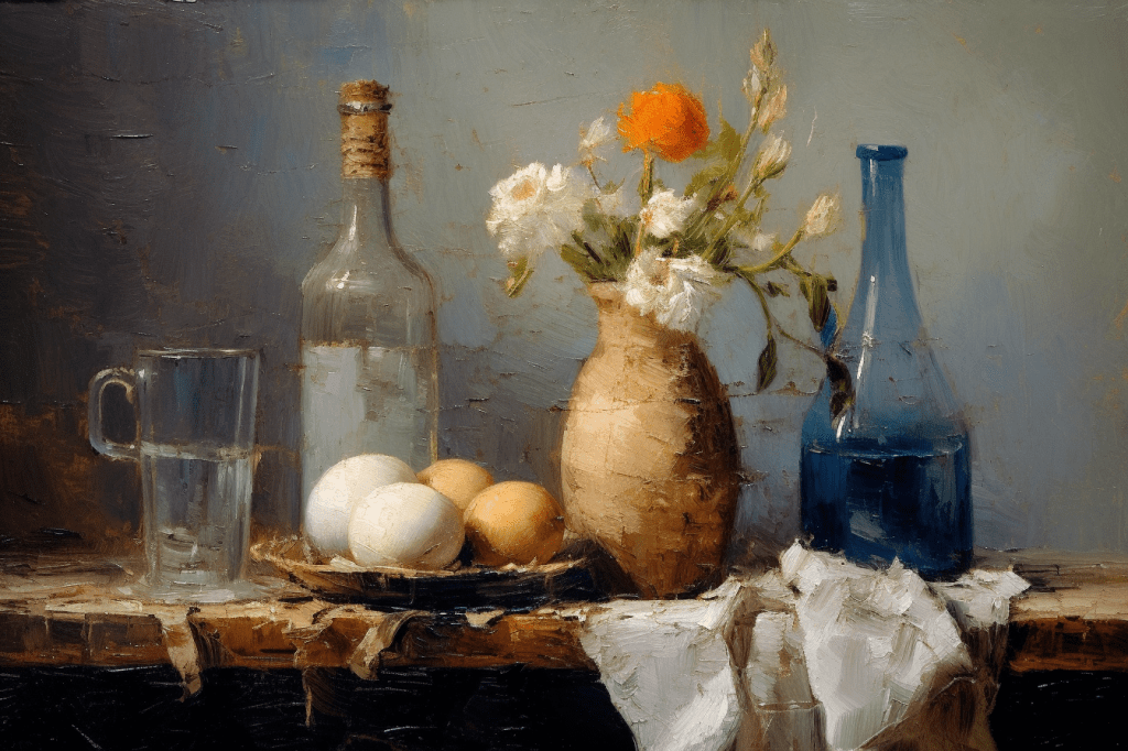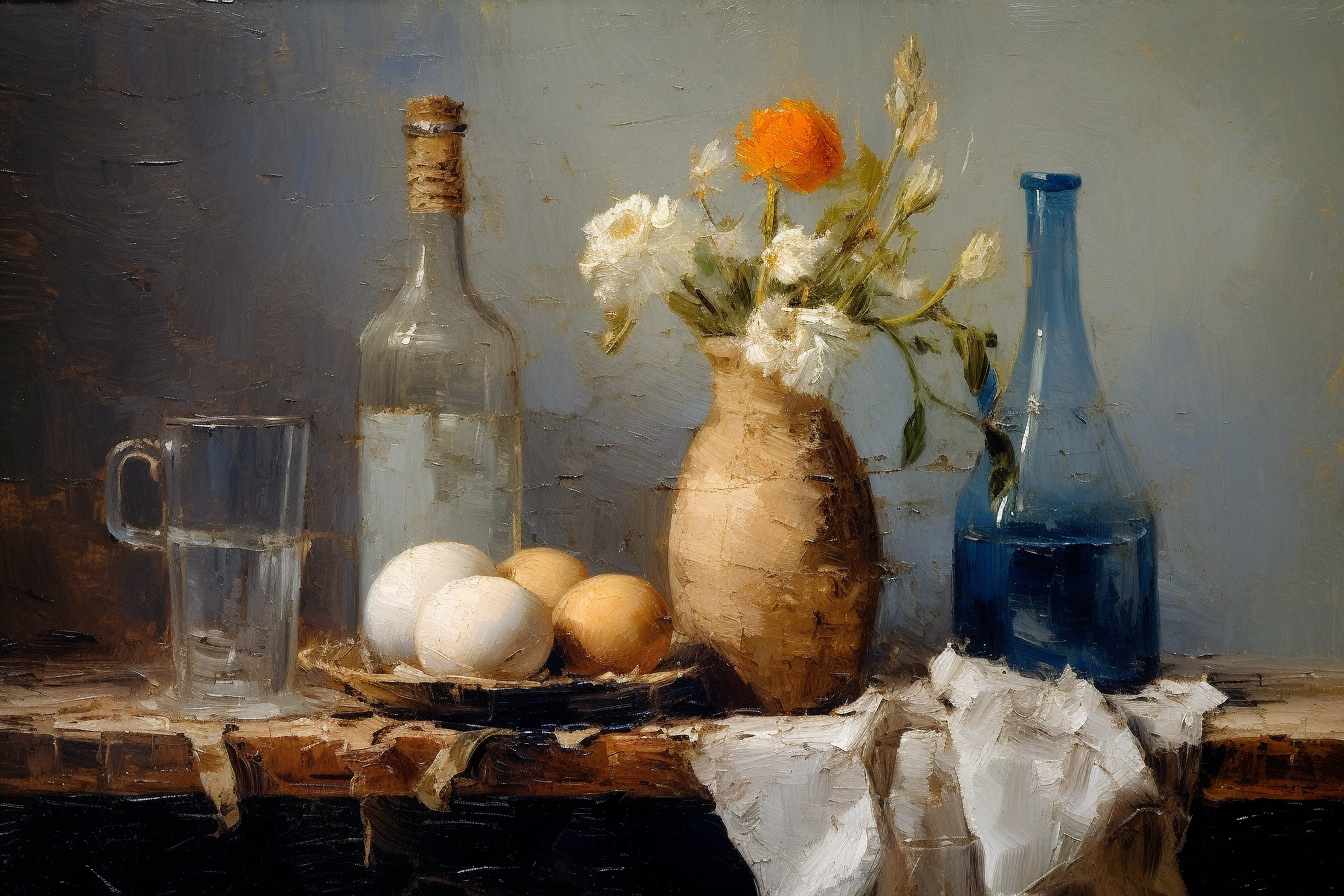 A still-life oil painting in the granular impasto style of Jean-Baptiste-Simeon Chardin. Water glasses, water bottles, dry flowers, eggs, cloth, light from open window on the left, reflections on the wet wall, rainbow, mist.