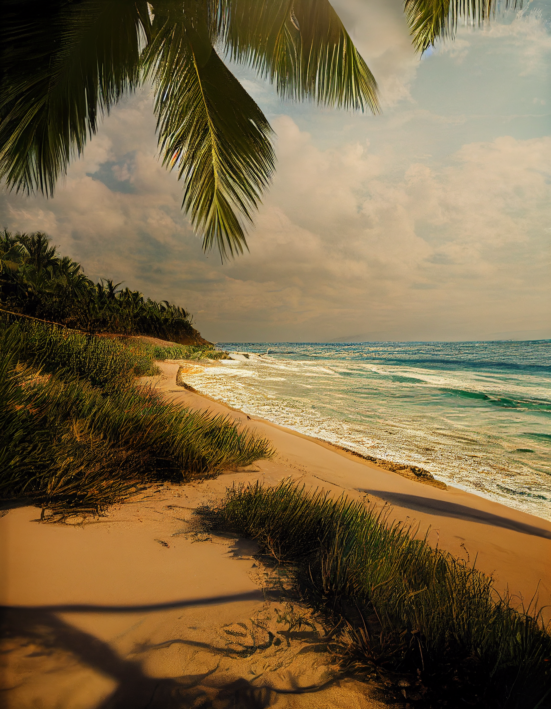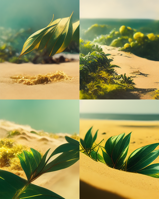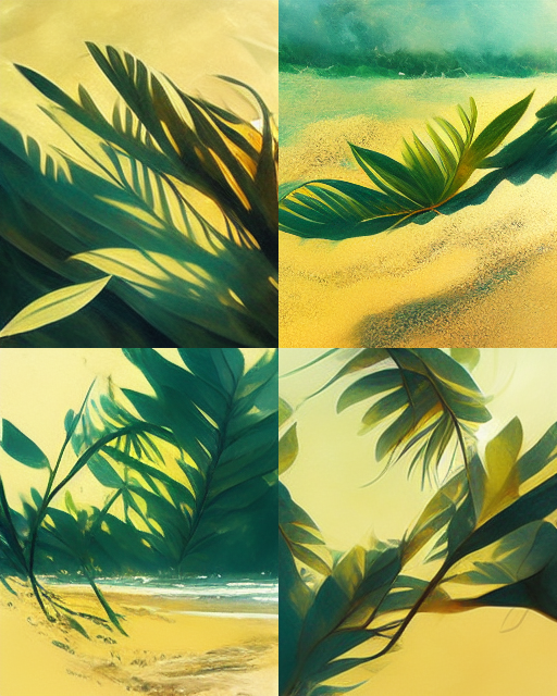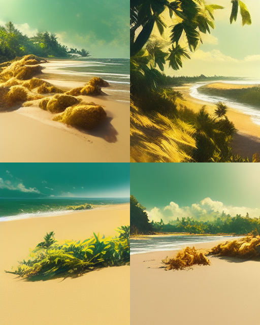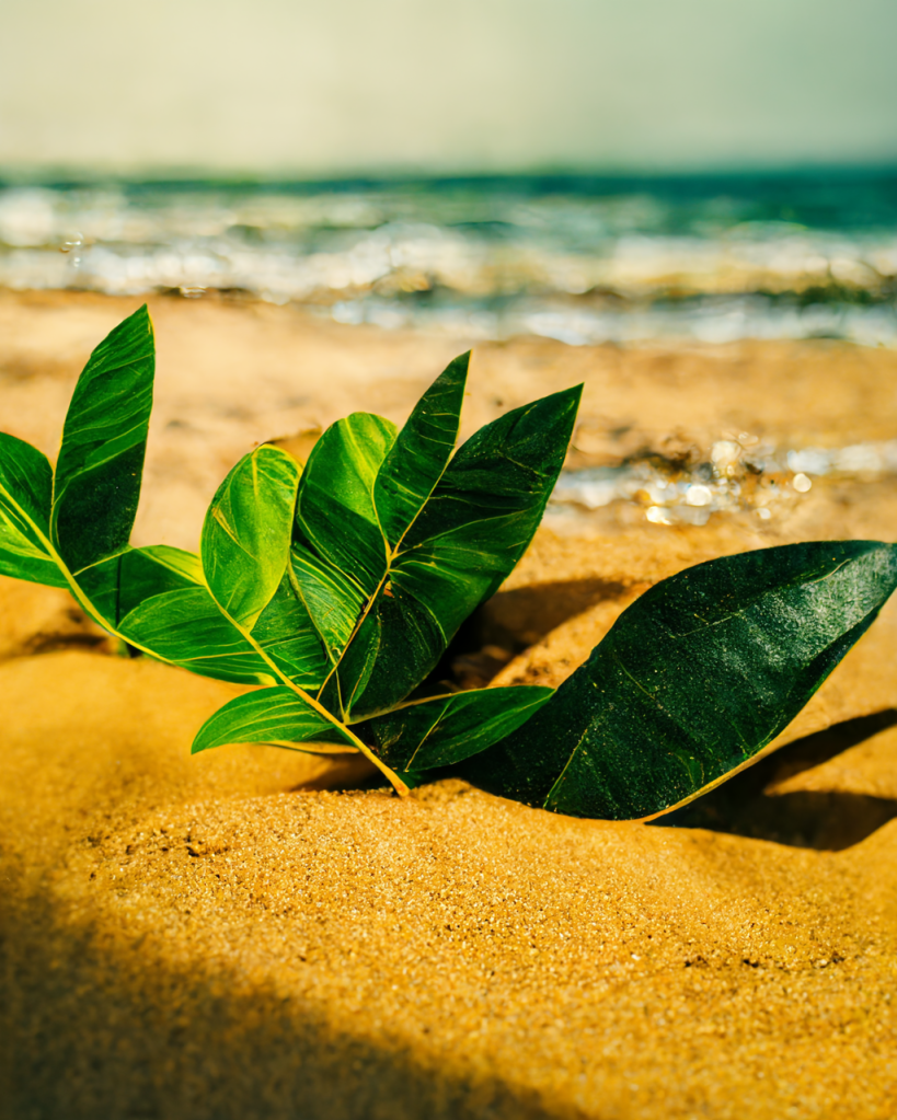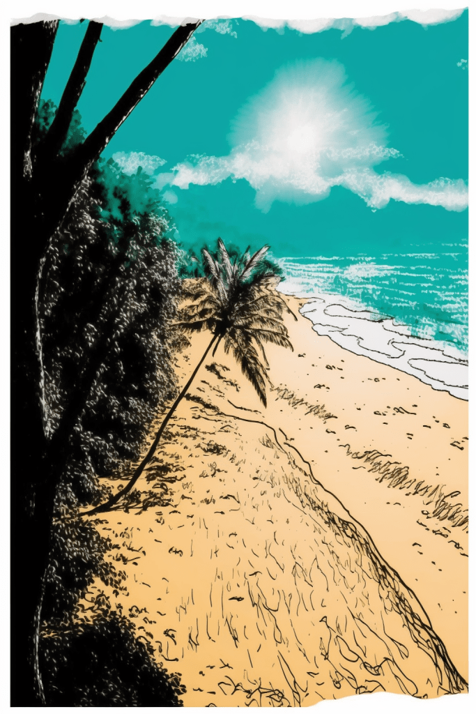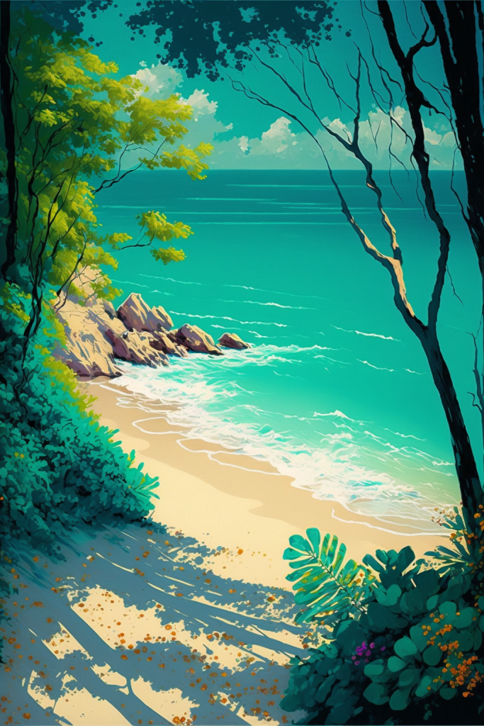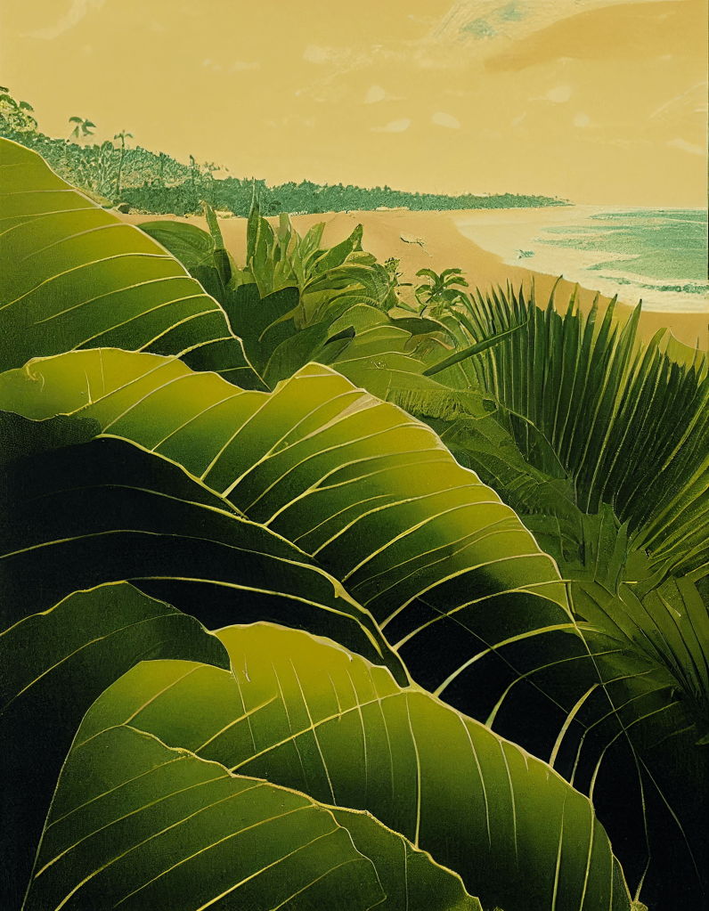 A bright sunny day by the turquoise sea, hot golden sand foreground, luscious green leaves, tropical forest background.