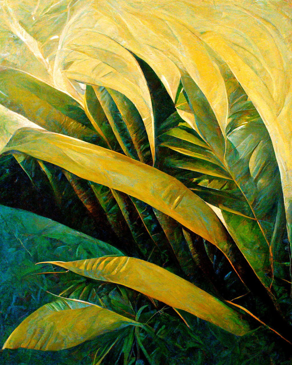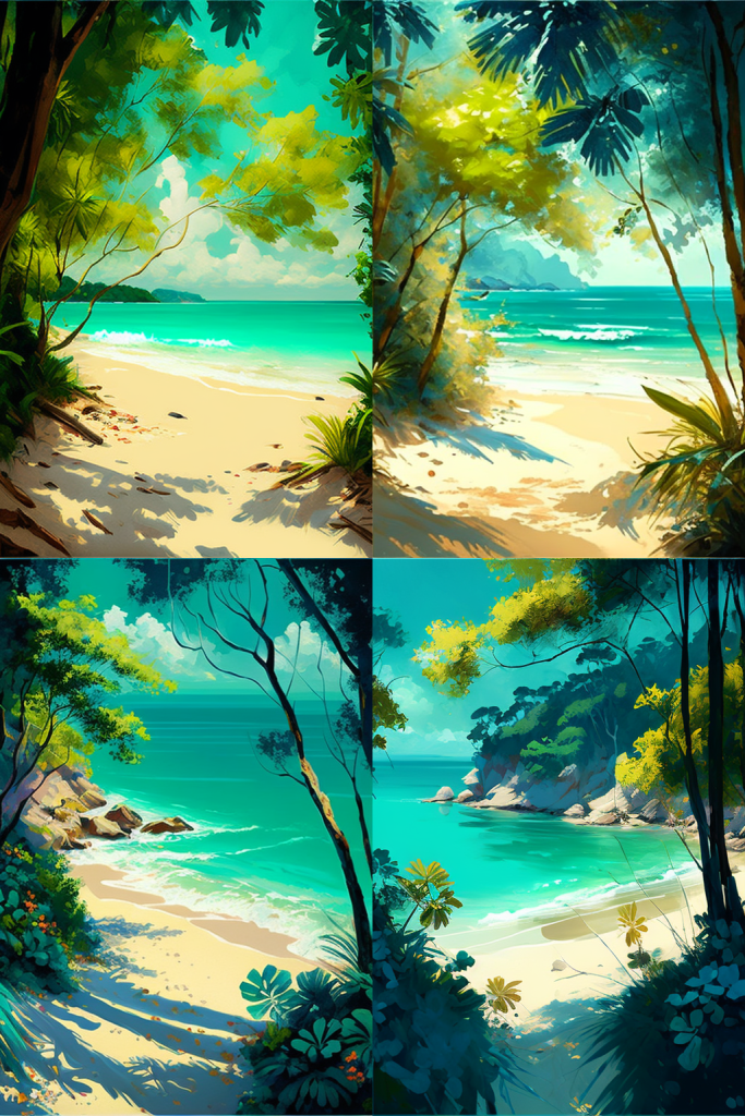 A bright sunny day by the turquoise sea, hot golden sand, luscious green leaves, tropical forest