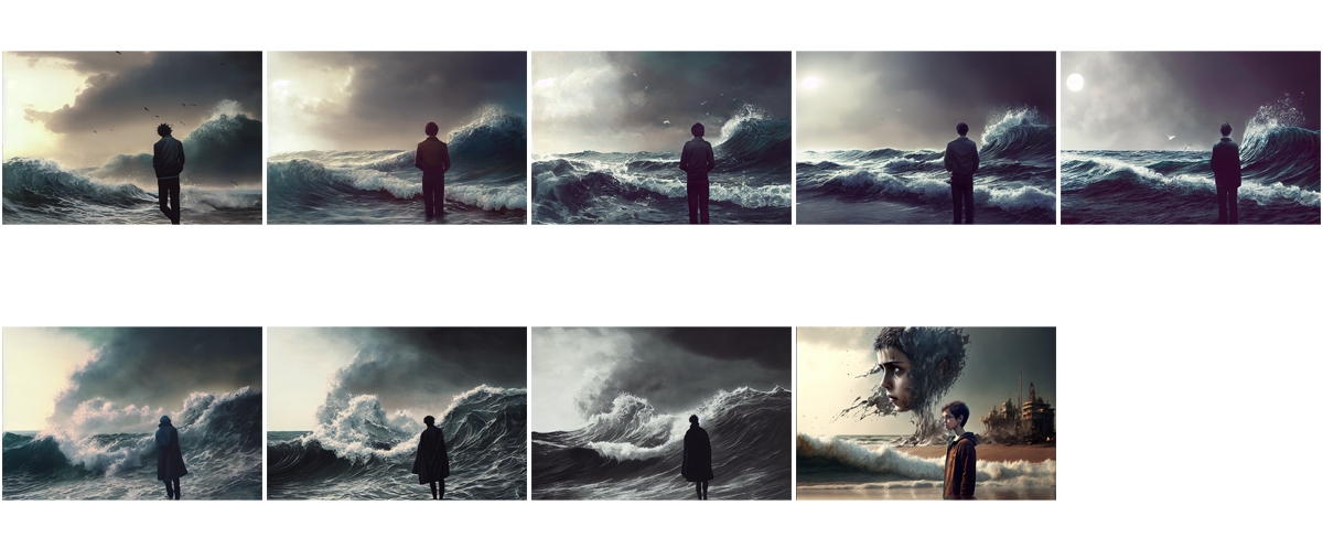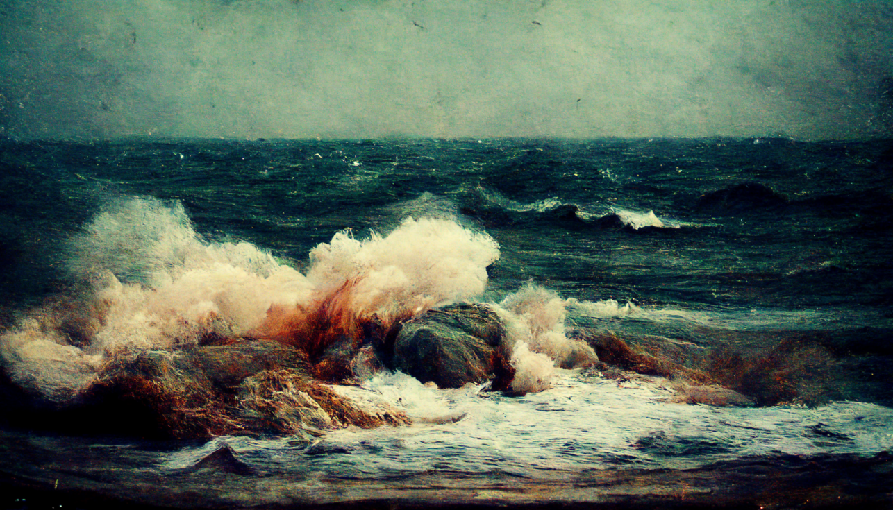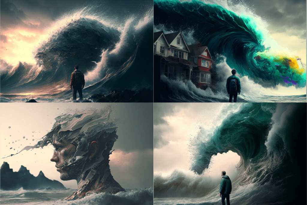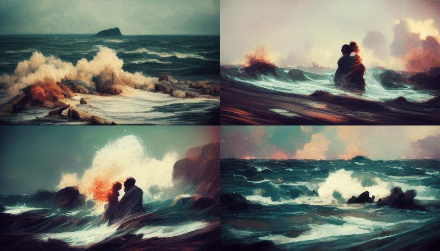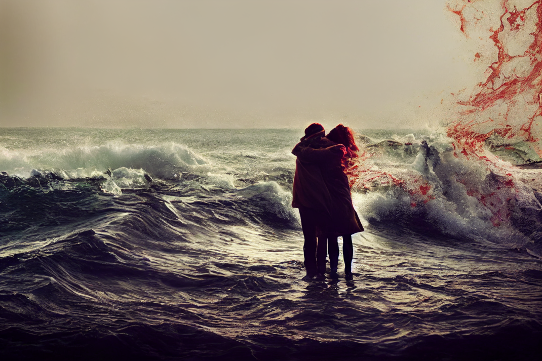 Overall, I see the images and think of the brutality that is part of human nature and how it’s just as prevalent as kindness or love. The bloody waves make me think that often the things that delight us the most end up smashing us in half. A bit like – well you’re fucked either way. It’s like the AI sees and privileges the destructive side of love humans tend to ignore until they are in it.