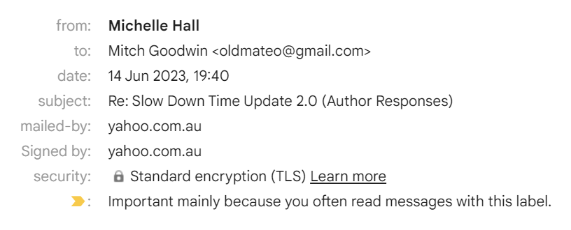 Hall, M., Goodwin, M. & Midjourney, “Michelle Hall – Crash,” in Slow Down Time, Goodwin, M. Ed. Melbourne: Word Press, April 17, 2023, https://slowdowntime.com/michelle-hall/