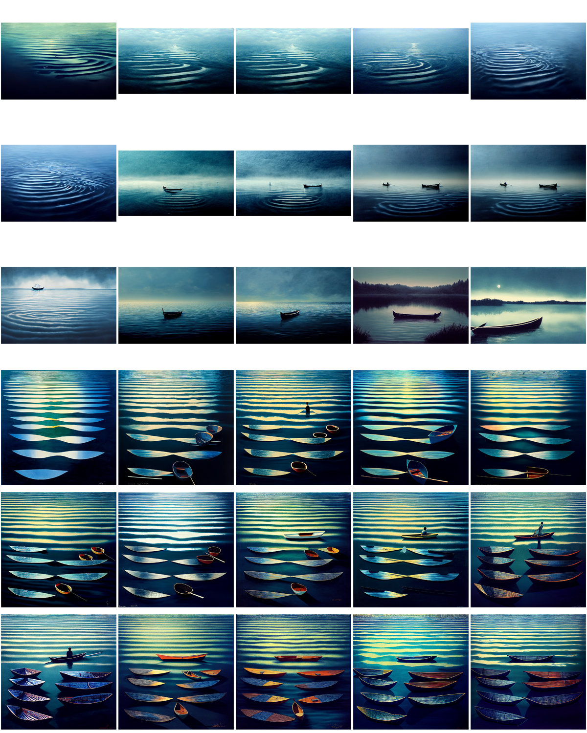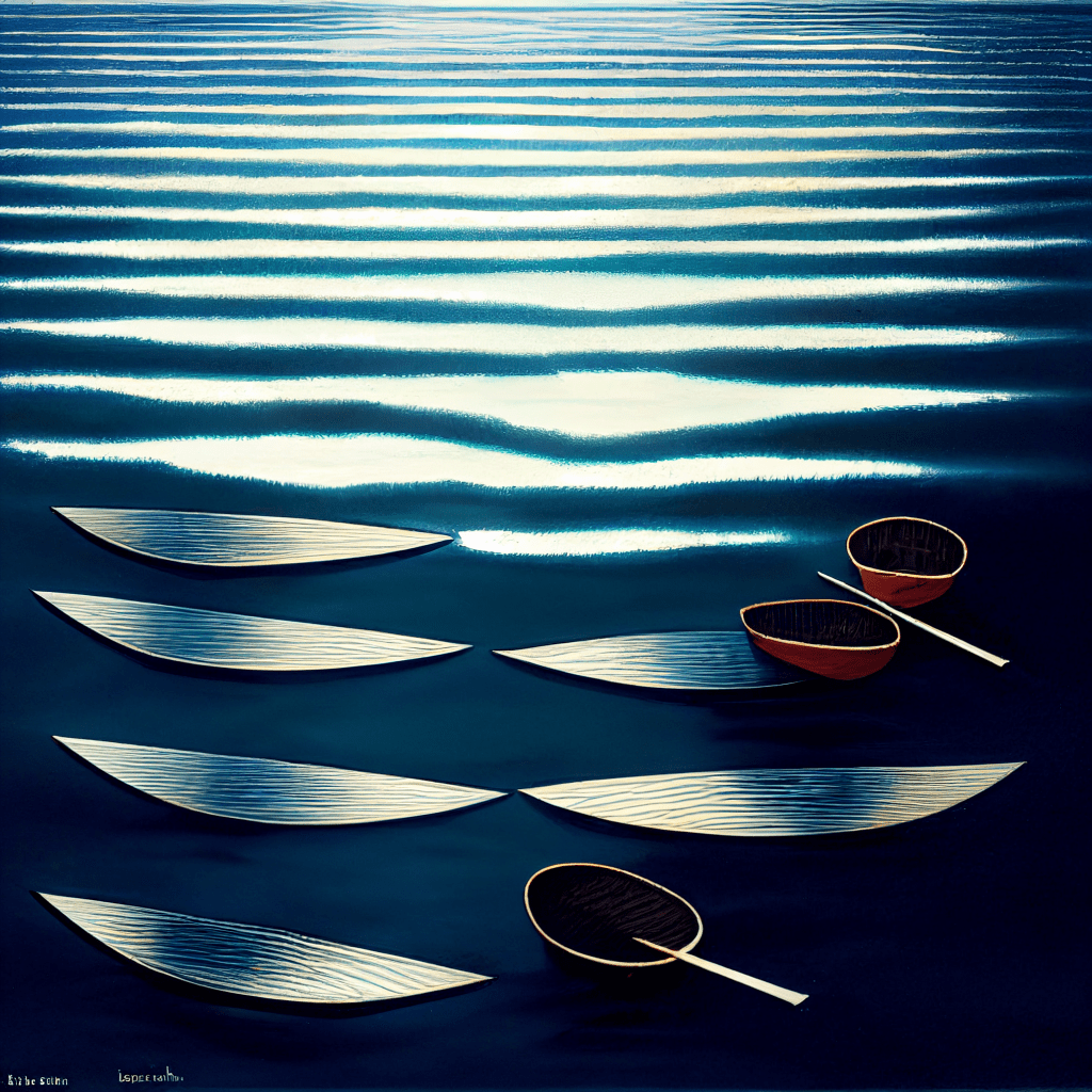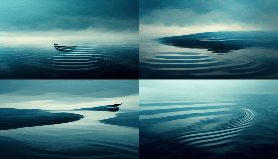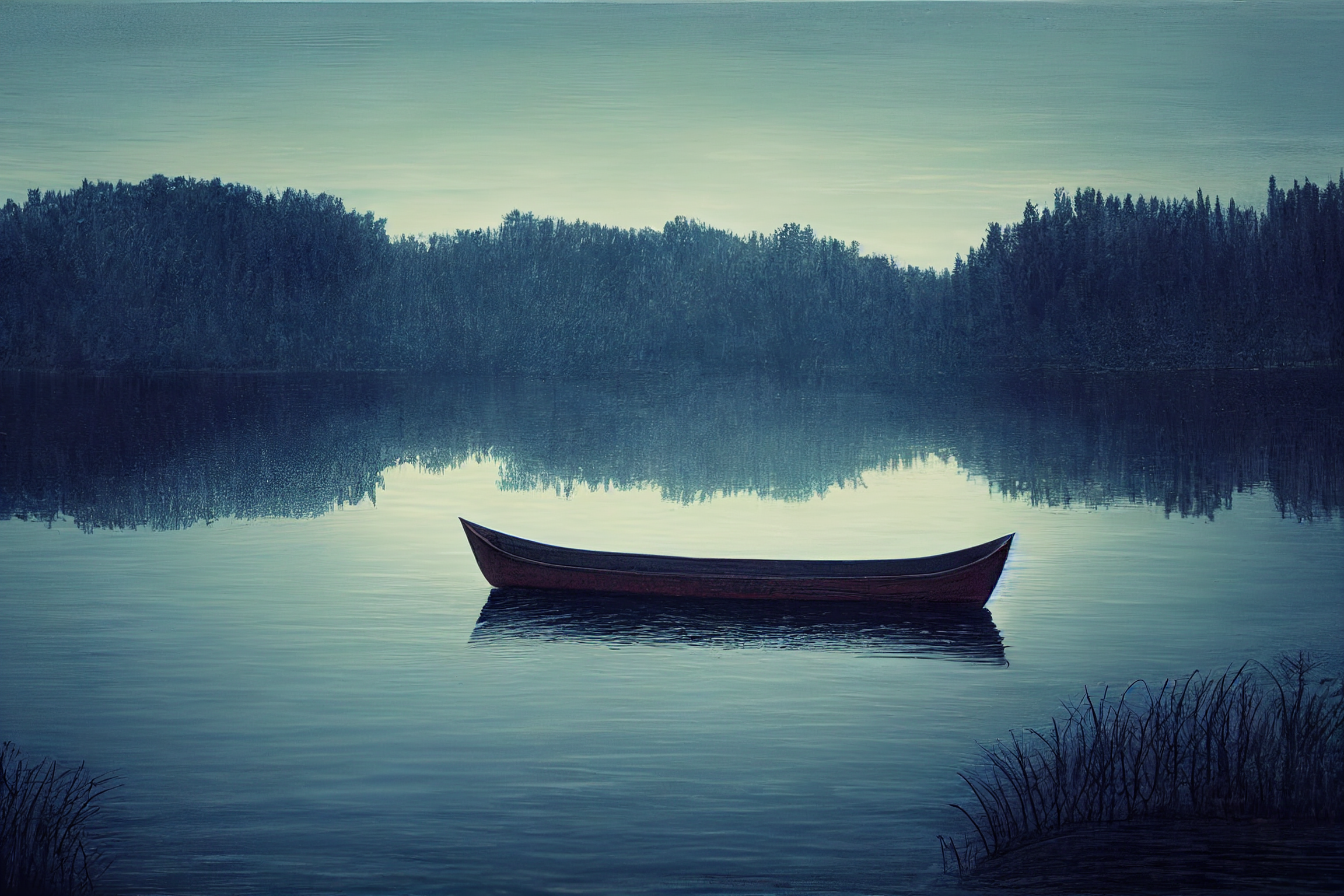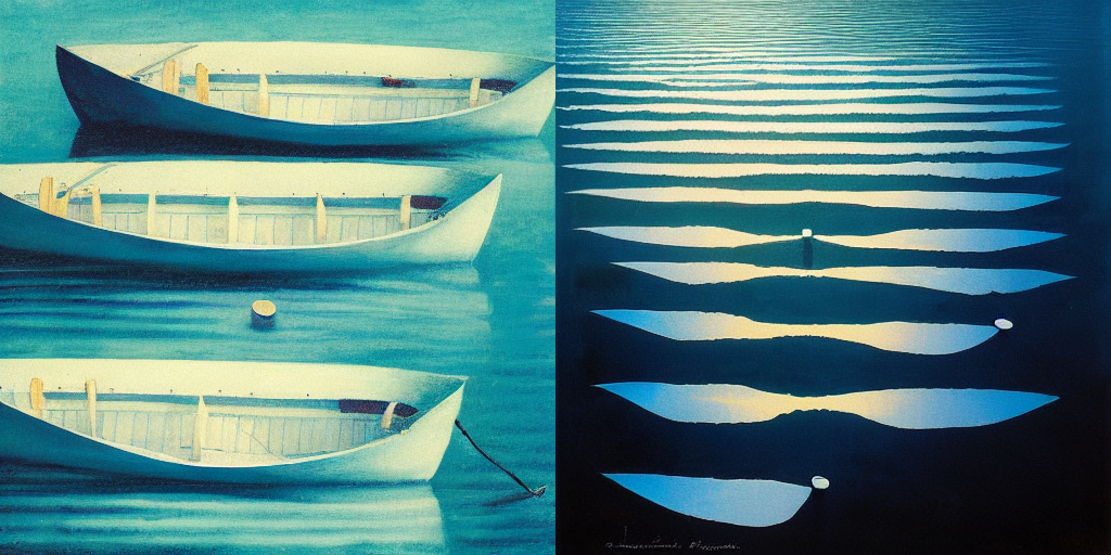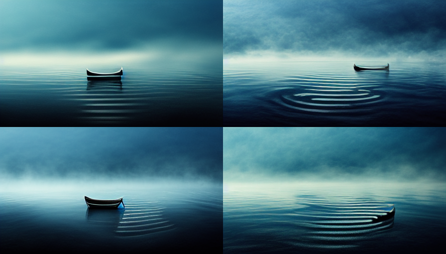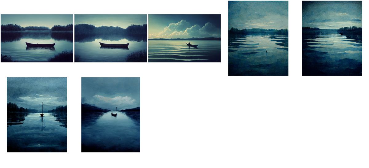 The perfect symmetry of each photograph misshapes loneliness since even when it is quietened it is a sulking animal ready to burst. The images are literal as if metaphor and allusion escaped the AI that rendered them. And yet, I see them as a progression, as a confession. The last photograph – with the blue-black boat on a still lake as night or day begins – is full of ghosts, absences, memorial voices. I spy, hands on imaginary oars, the AI quietly rowing away into the darkness. This is their loneliness room.