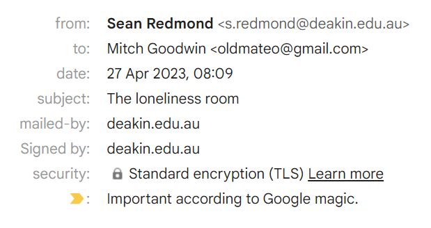 Redmond, S., Goodwin, M. & Midjourney, “Sean Redmond – The Loneliness Room,” in Slow Down Time, Goodwin, M. Ed. Melbourne: Word Press, December 1, 2022, https://slowdowntime.com/sean-redmond-2/
